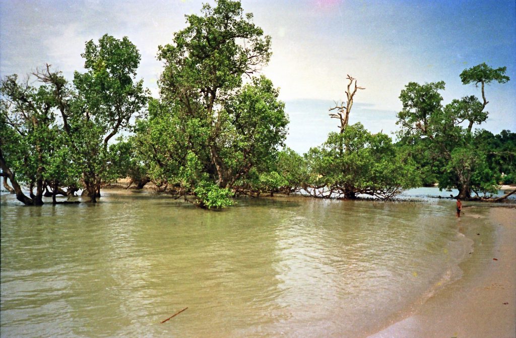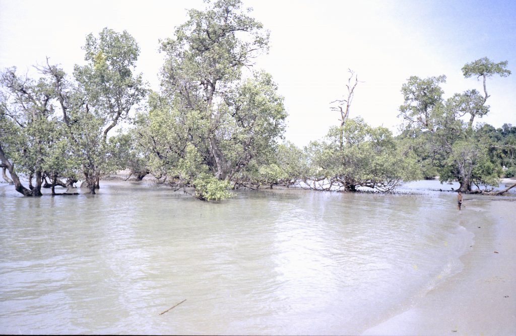 Vandet var jo forsvundet nogle timer pga tidevandet, så i perioder kunne vi gå på havbunden mellem mangrovetræernes kæmperødder.