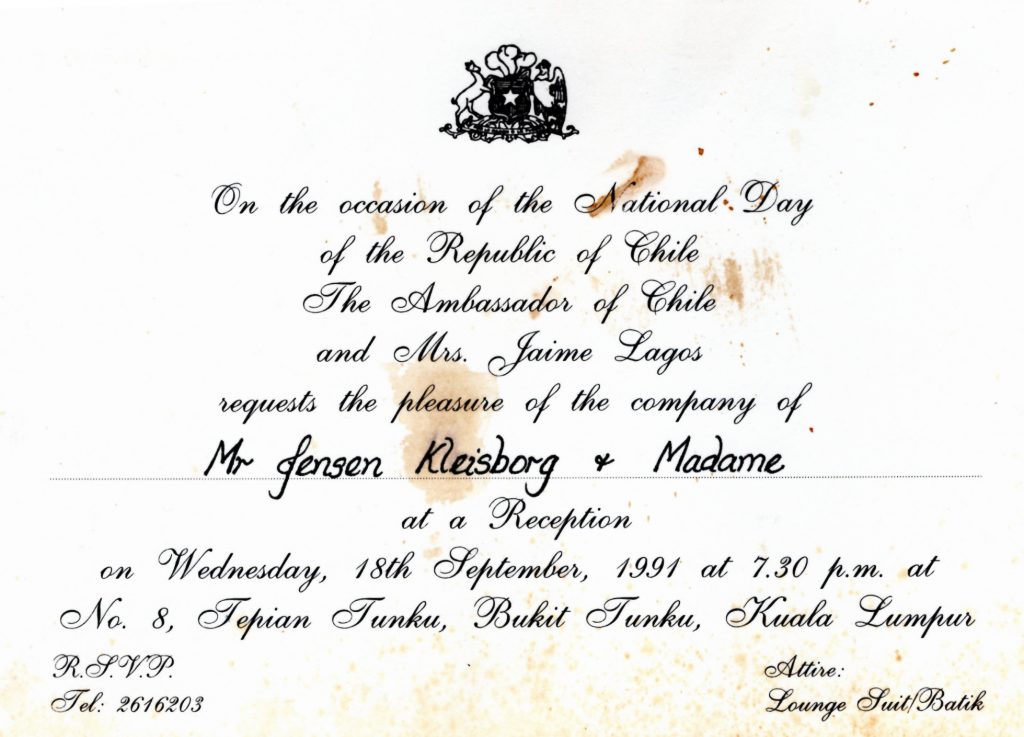 Vi er blevet så gode venner, at vi sandelig også var inviteret med til en stor reception på Chiles ambassade i anledning af deres nationaldag. Her mødtes vi med ambassadører fra mange andre lande – inklusive den danske, som var noget forundret over at møde os der.