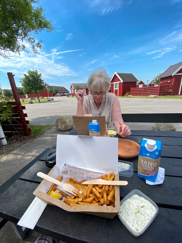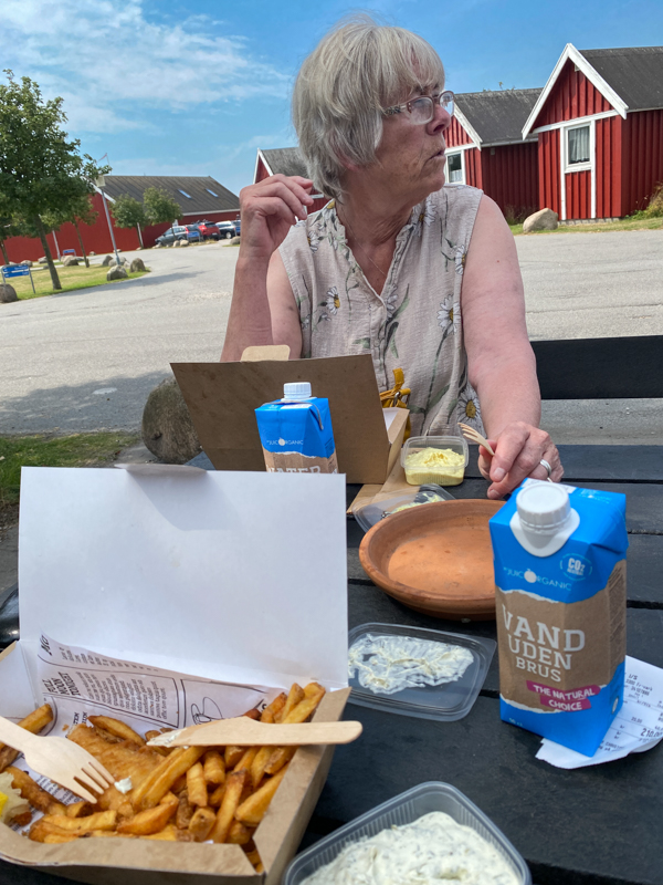 Kirsten købte 2 fiskefrikadeller med pommes frites, og jeg fik en gang fish & chips.