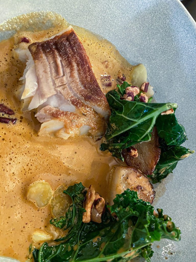 STEGT MØRKSEJ MED JORDSKOKKER, GRØNKÅL, PECANNØDDER & REJEBISQUE
