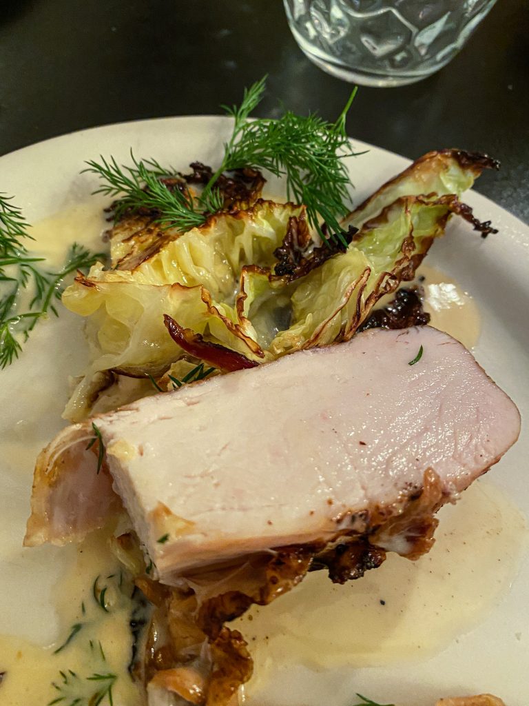 ROKKEDAHL KYLLINGEBRYST MED GRILLET SAVOYKÅL, BEURRE BLANC & SPRØD GUANCIALE