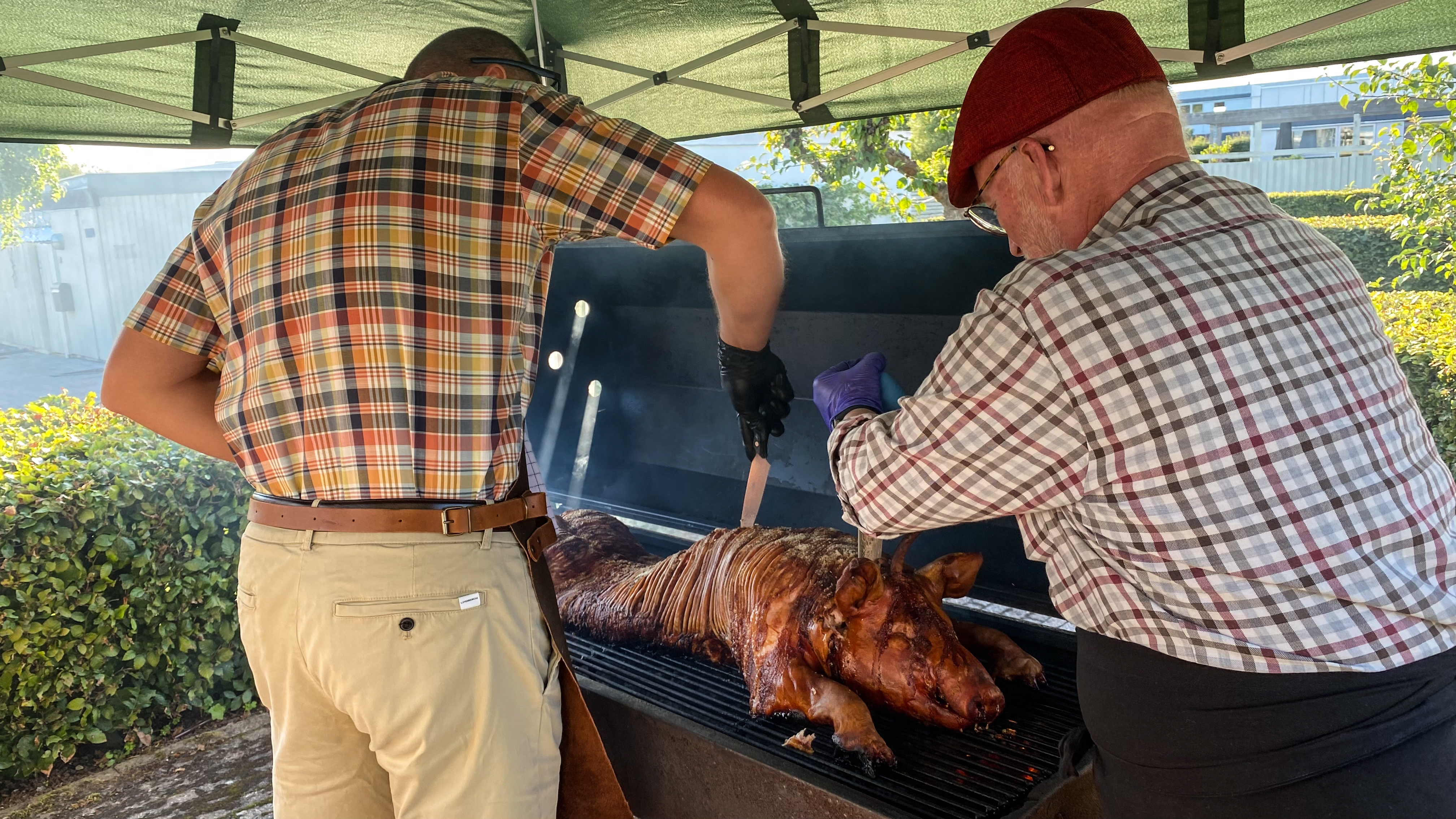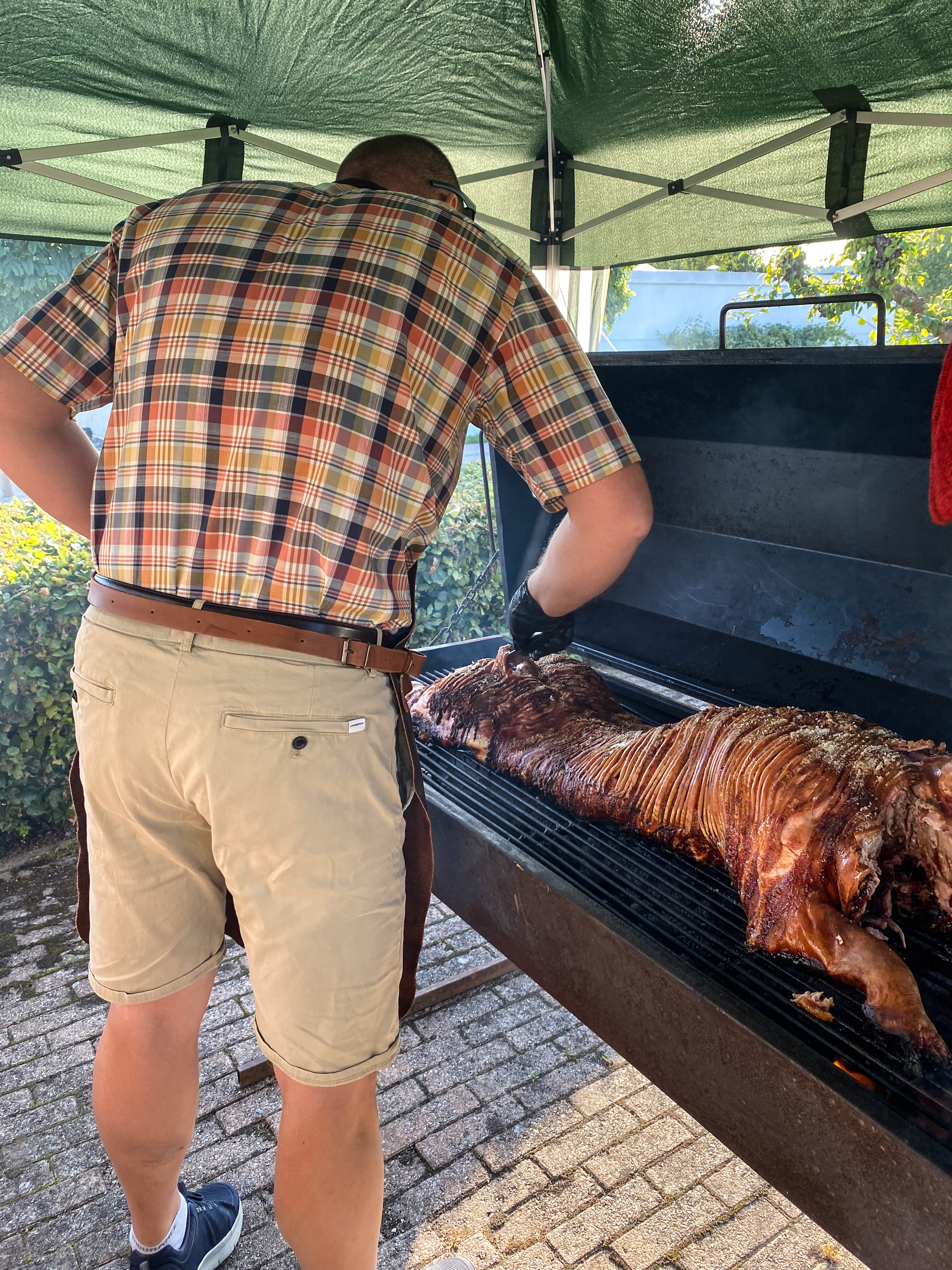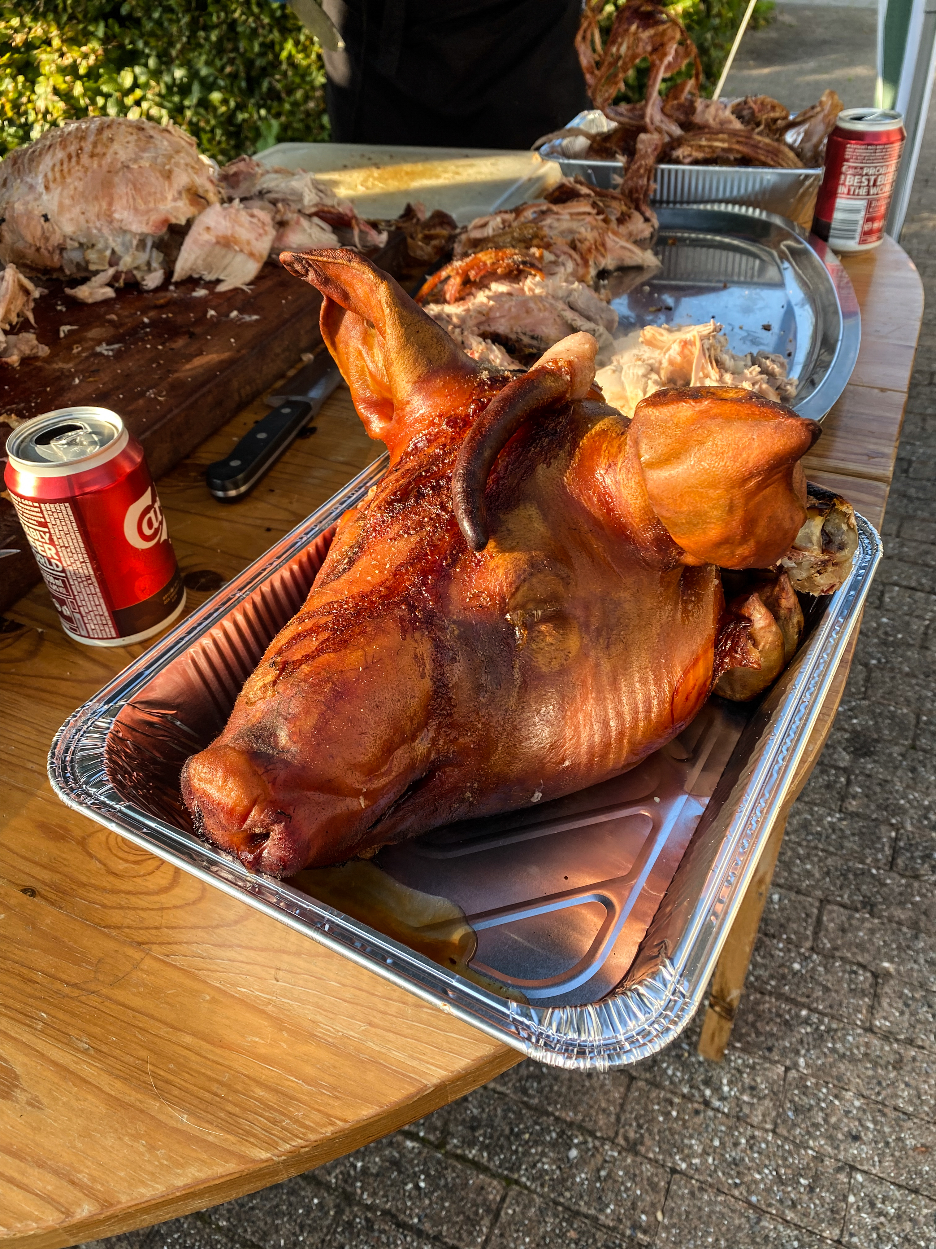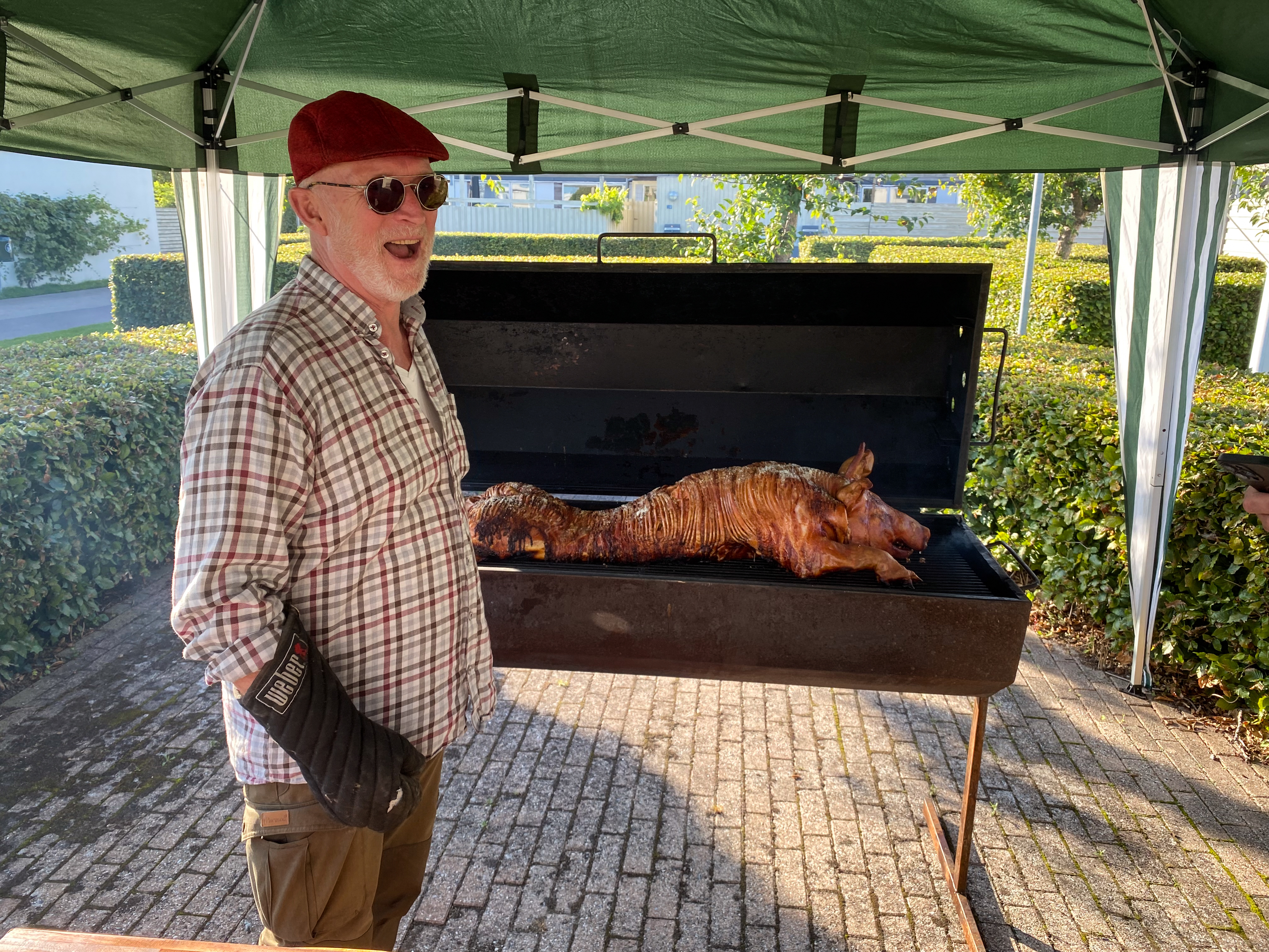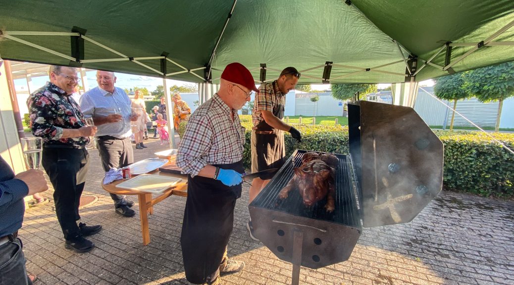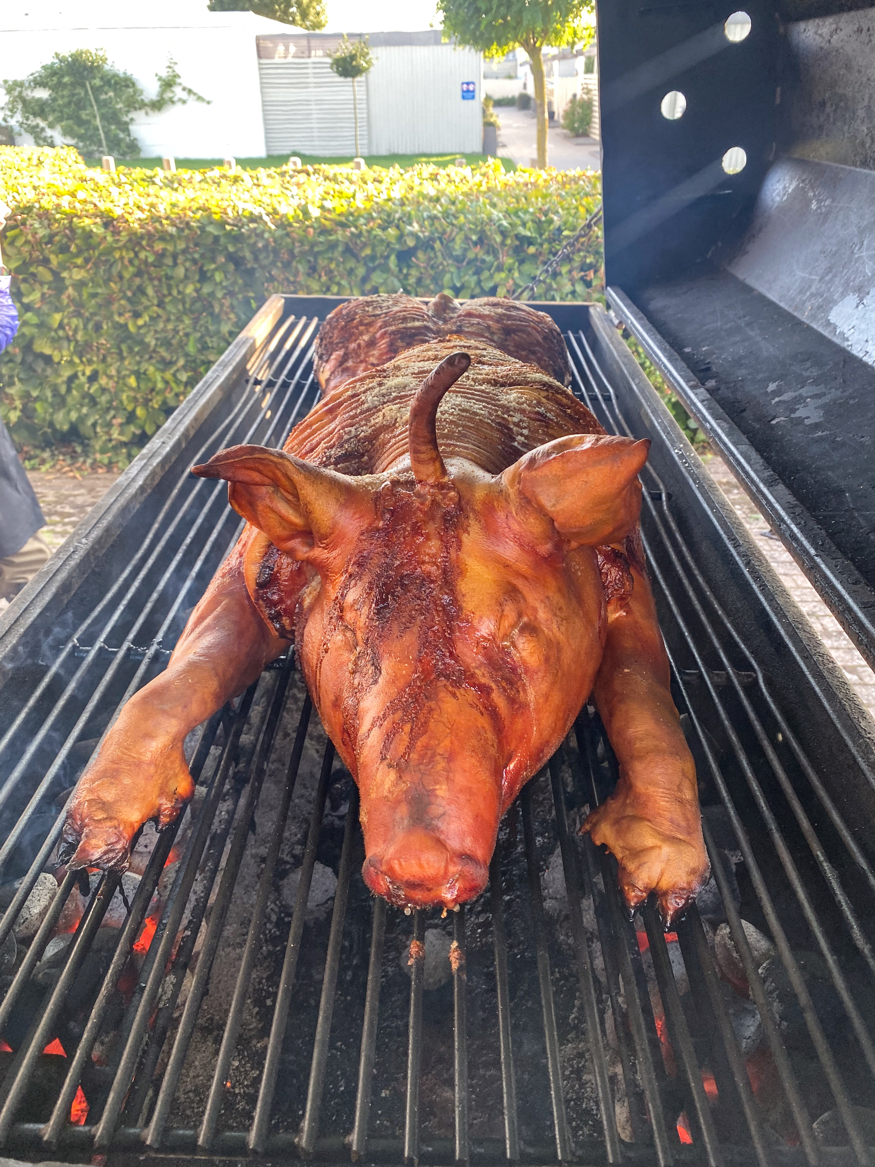Ved ankomsten blev vi mødt af duften fra en helstegt gris på grillen, så man blev da hurtigt lidt småsulten igen.