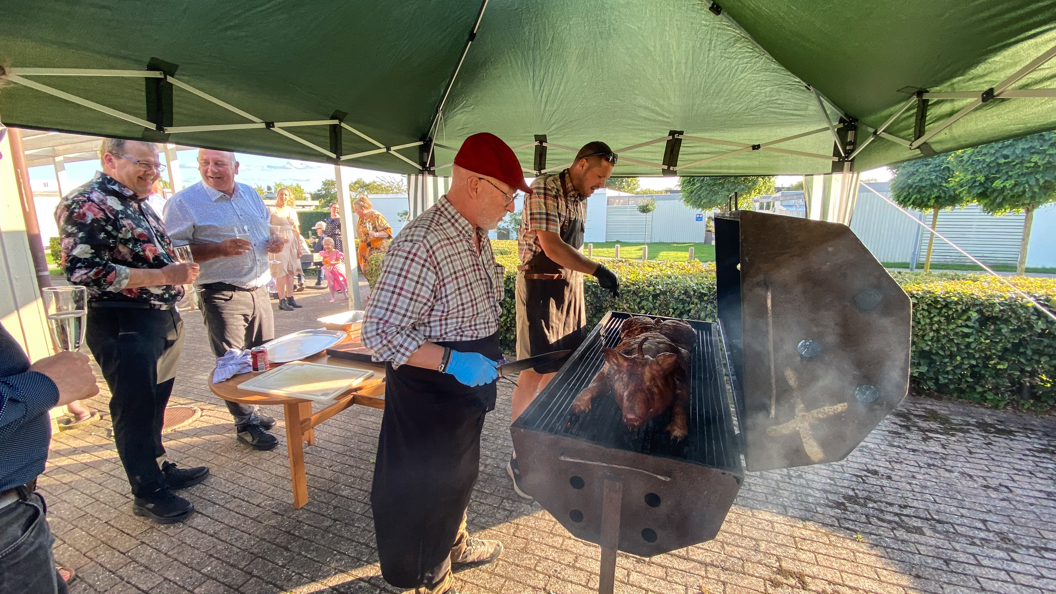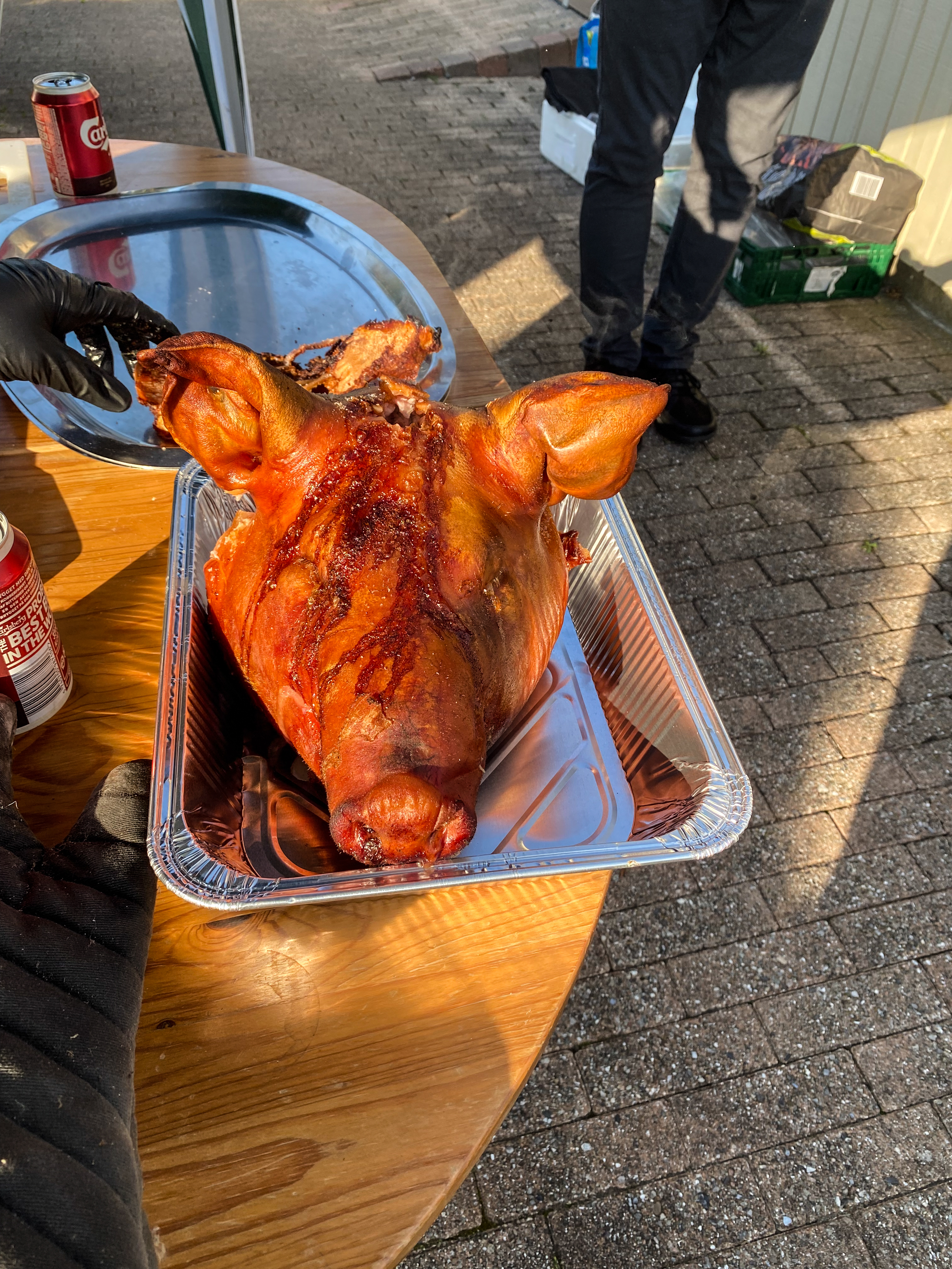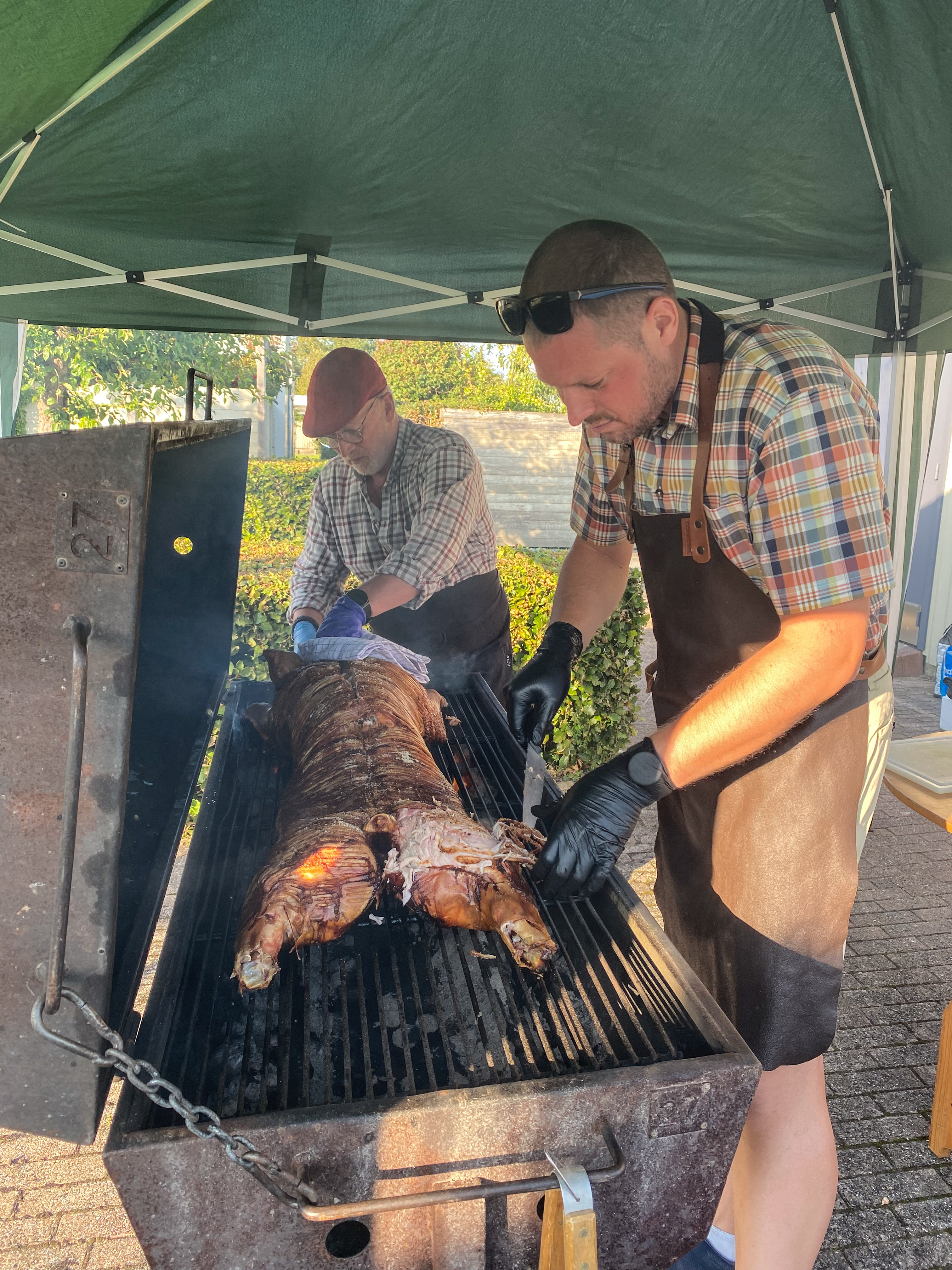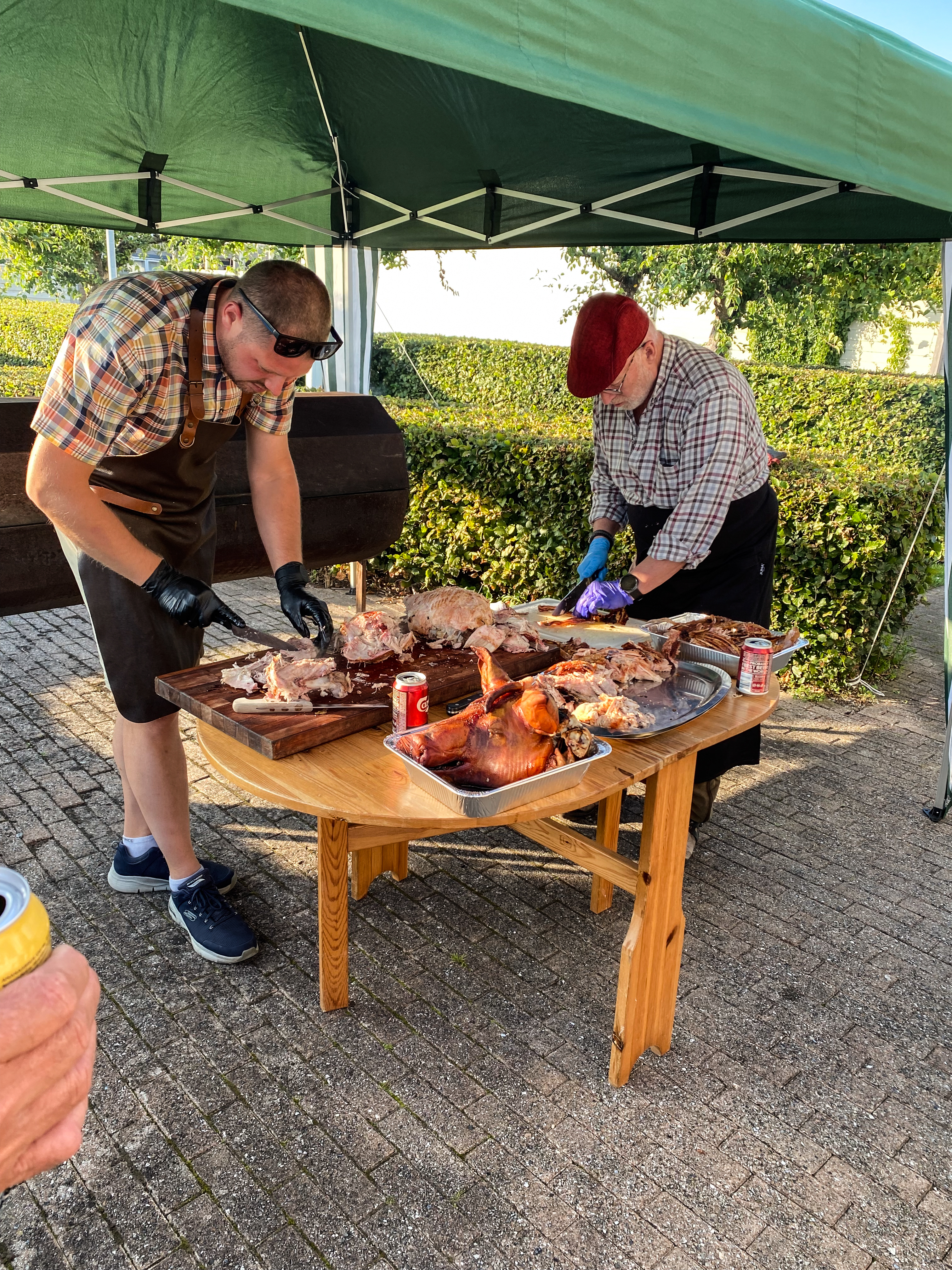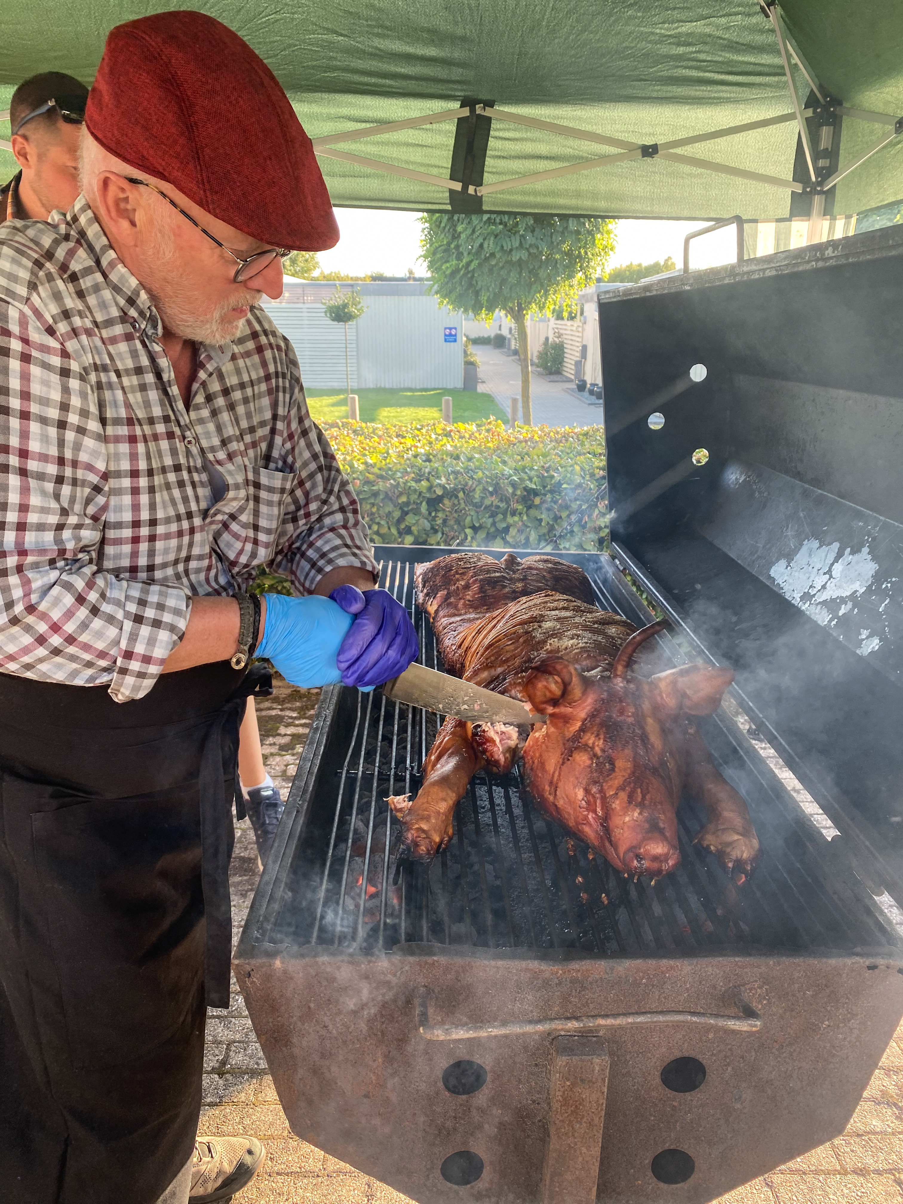 Ved ankomsten blev vi mødt af duften fra en helstegt gris på grillen, så man blev da hurtigt lidt småsulten igen.