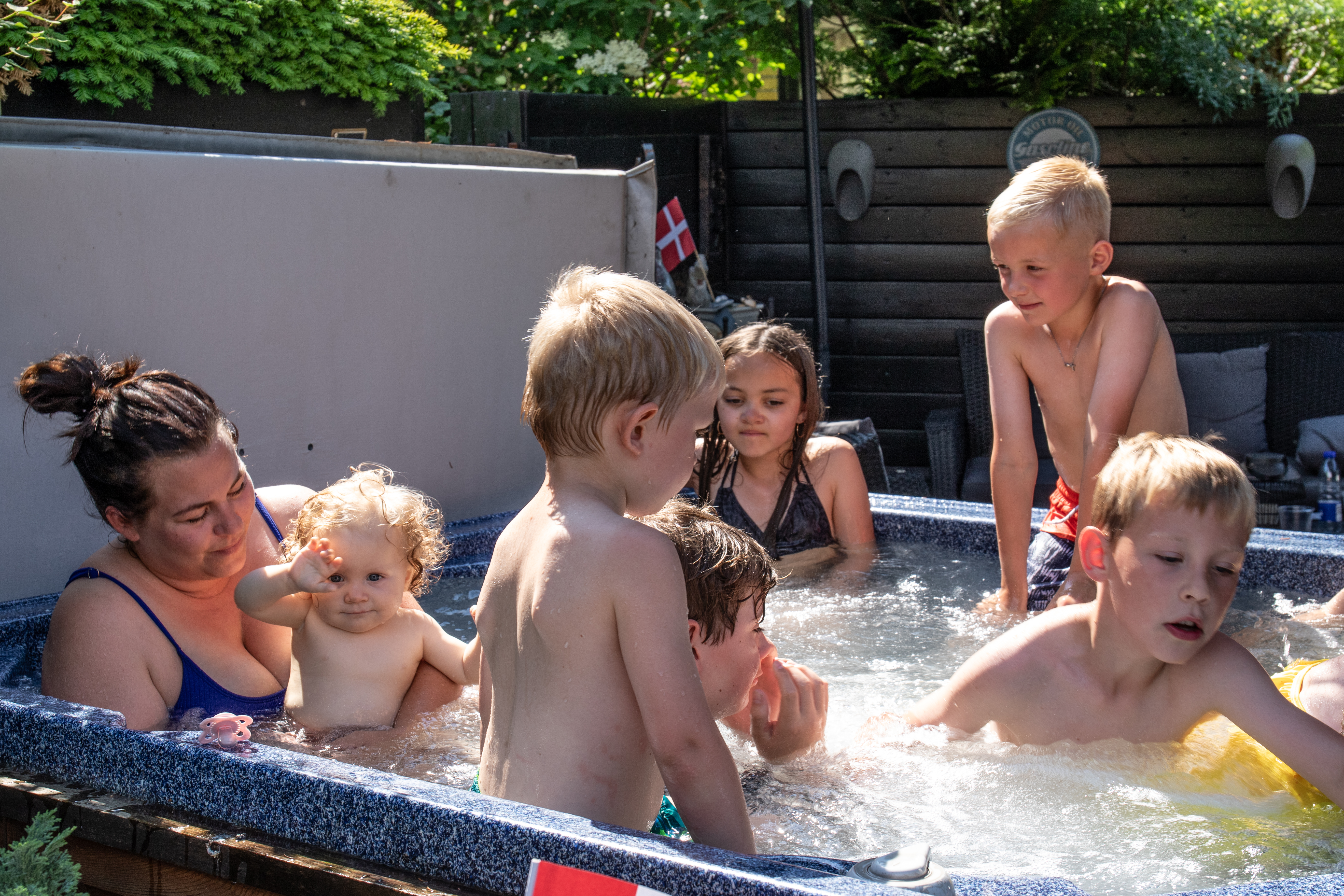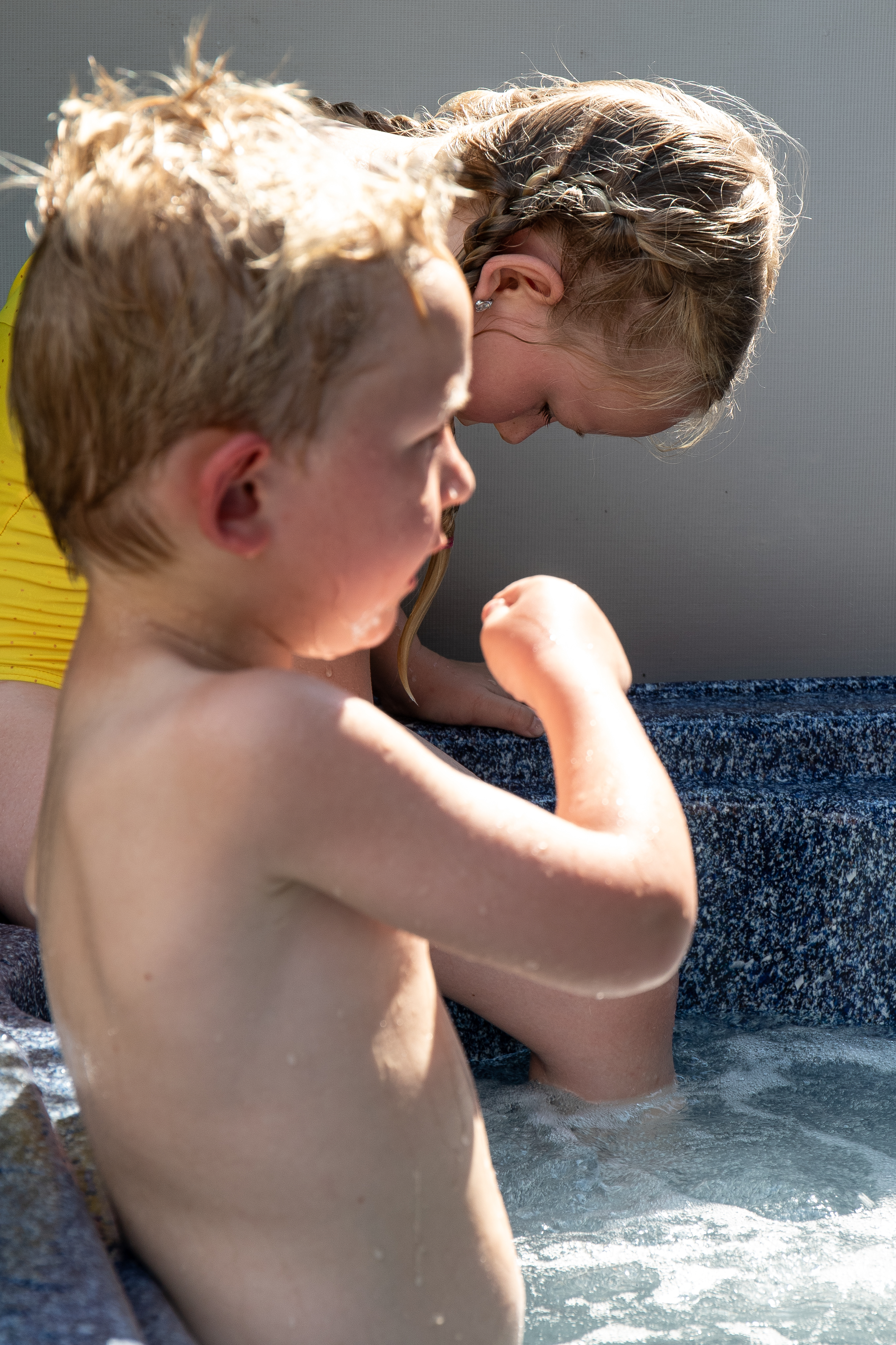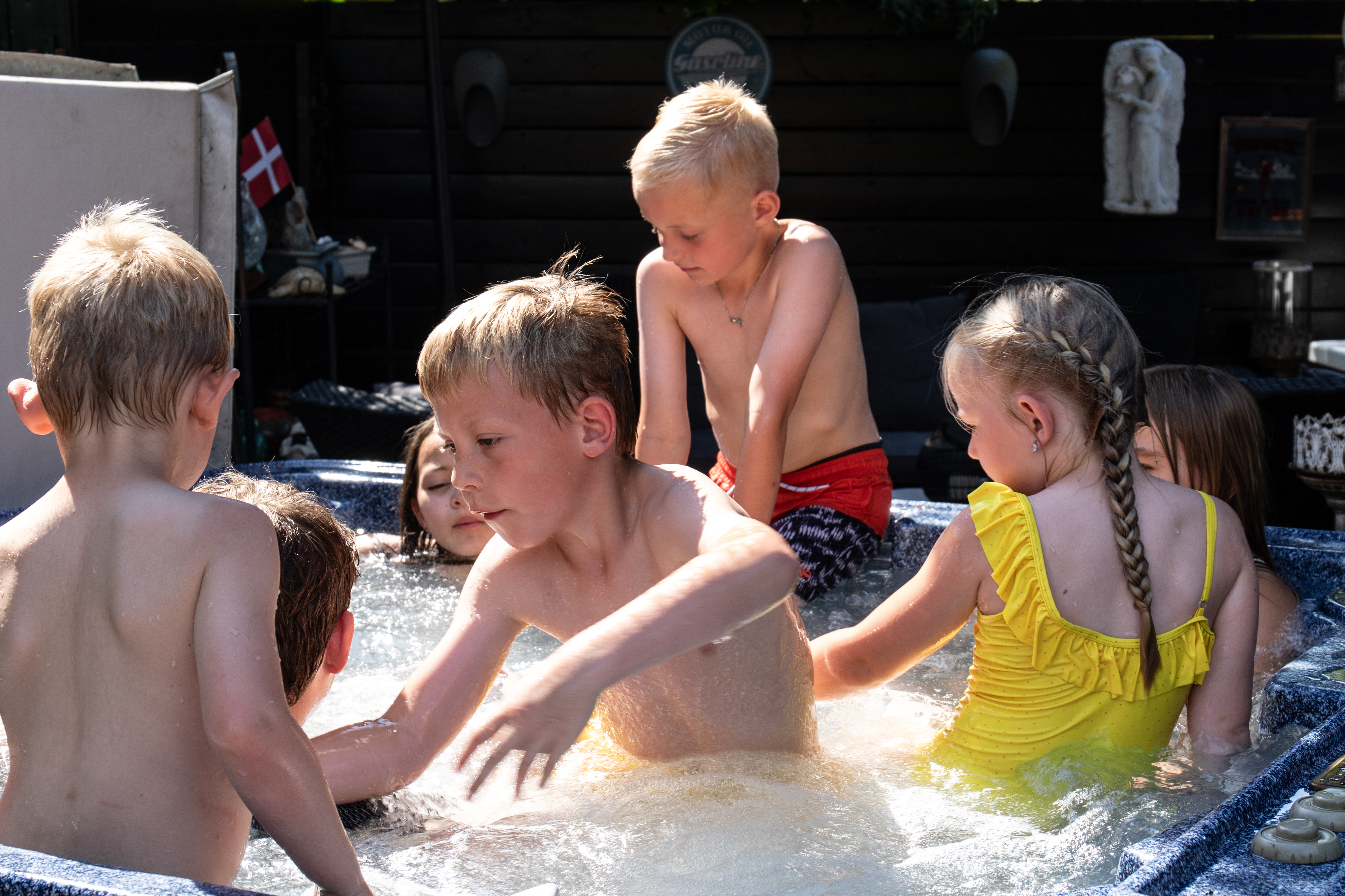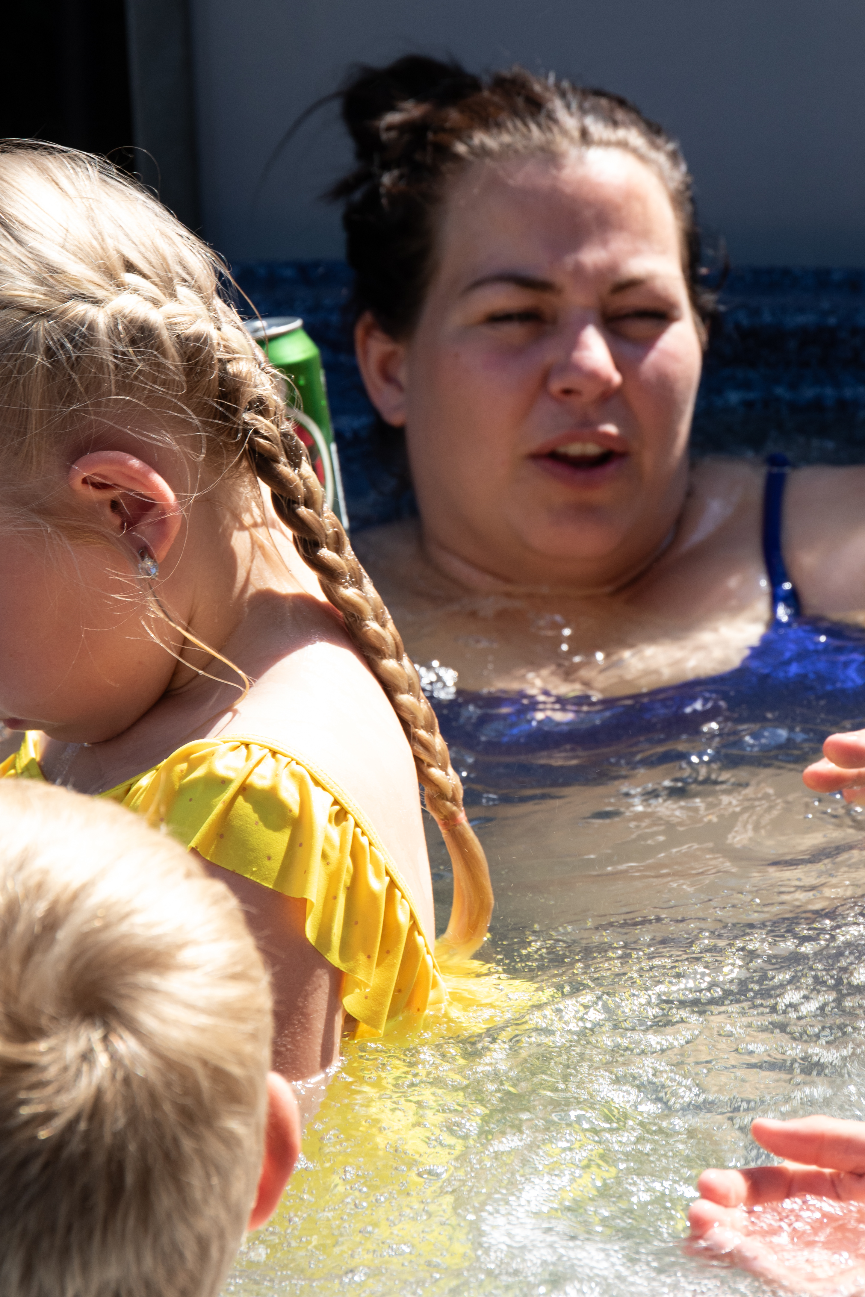 Spaen var selvfølgelig gjort klar med ekstra klor, der gør solbrændte børn (og Louise) helt hvide igen.