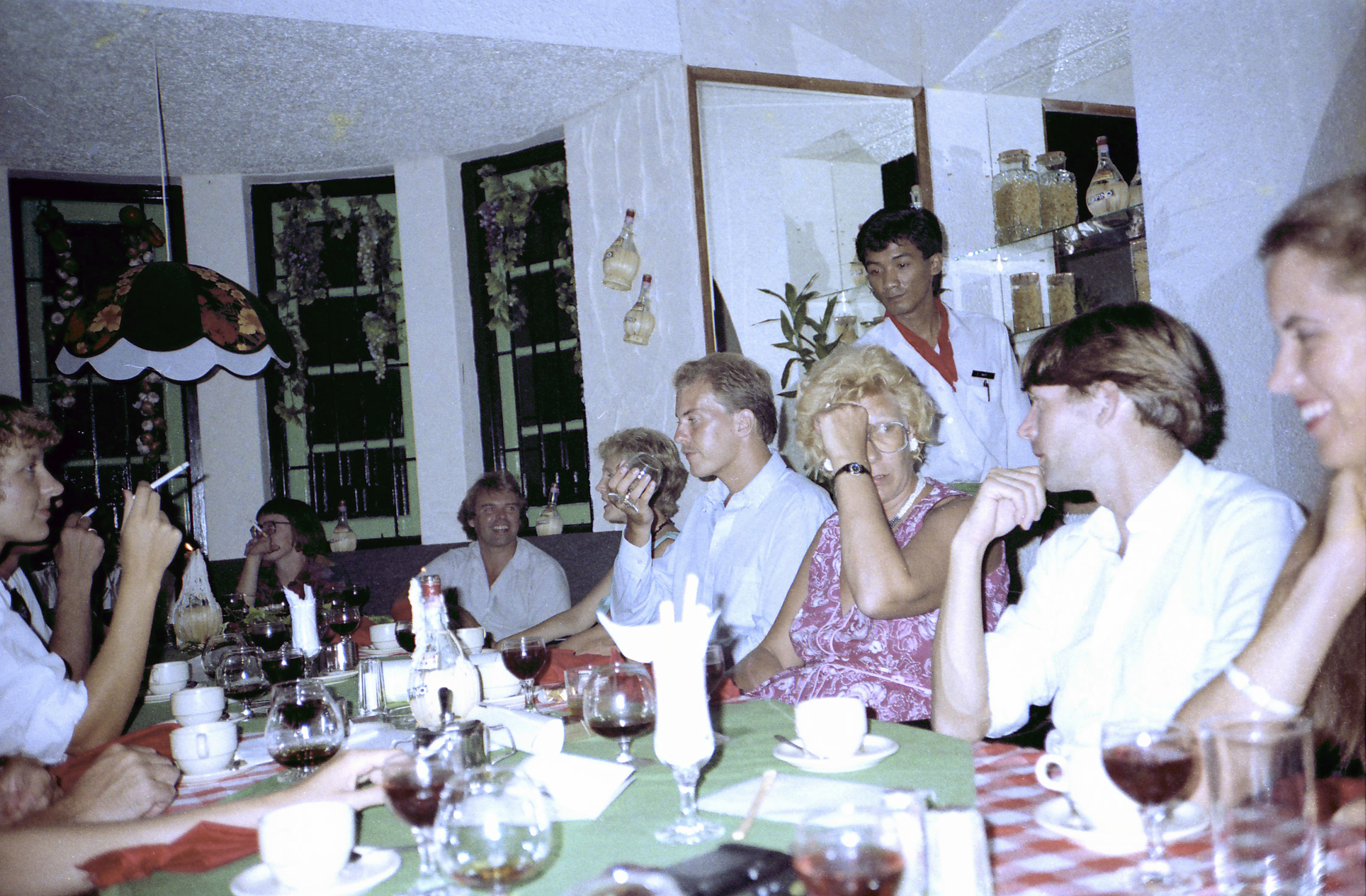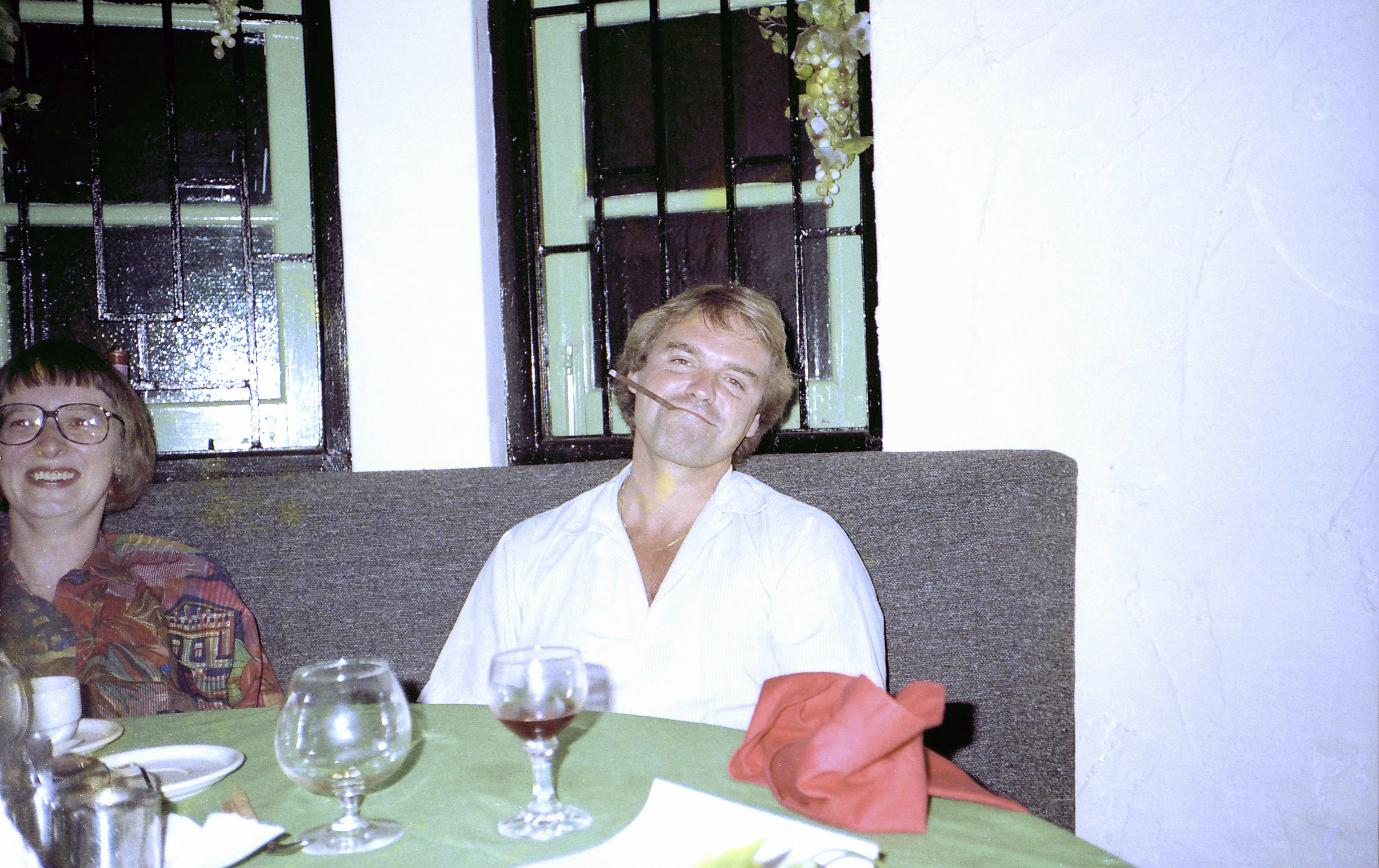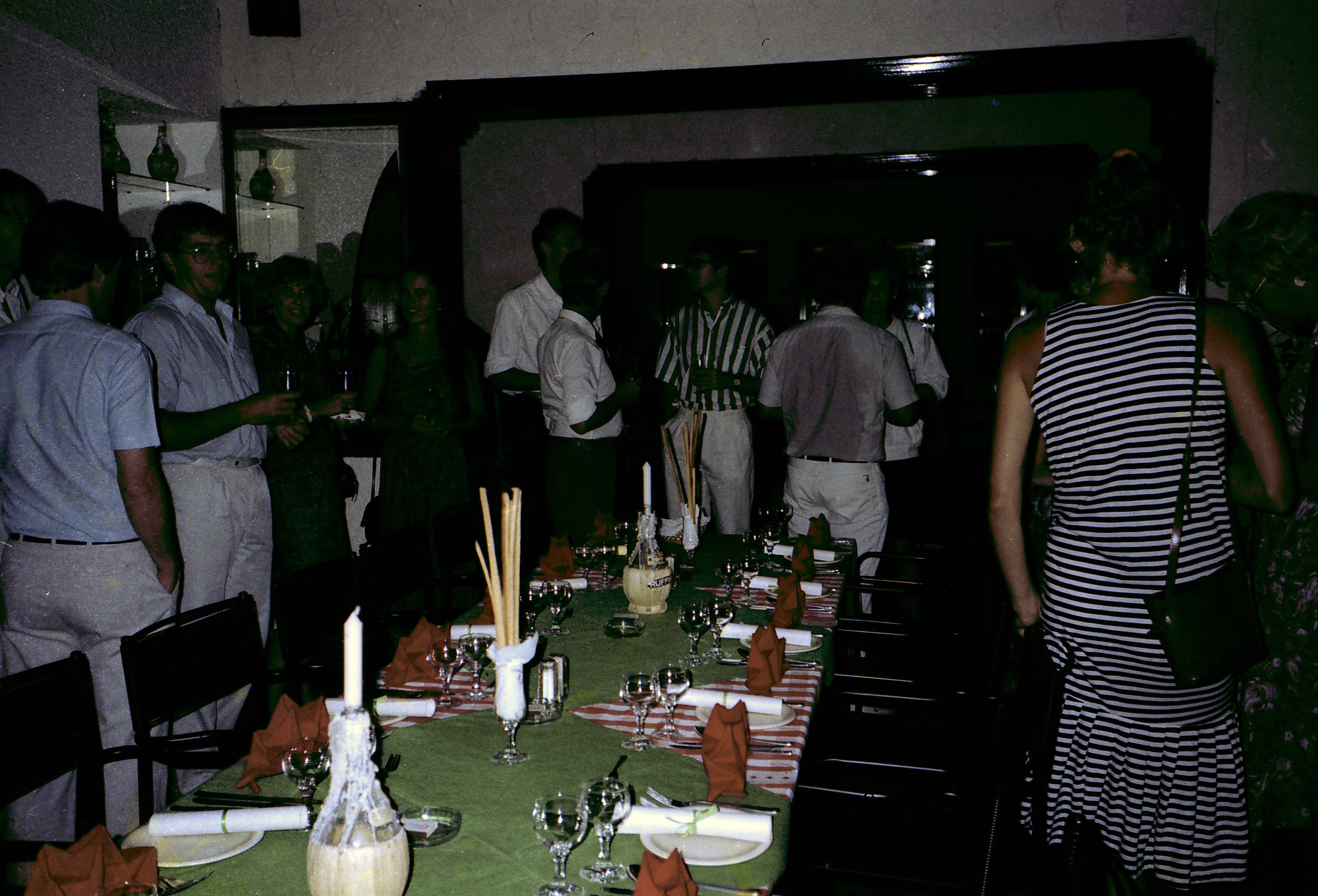 Under hele middagen kæmpede en sanger med sin guitar for at overdøve det efterhånden noget højrøstede selskab. På et eller andet tidspunkt – langt over tolv (tjenerne så umådeligt trætte ud og der havde længe ikke været andre gæster) – drog vi i taxaer til et diskotek, der ligger lige ved siden af, hvor vi bor. Så kunne alle bare vakle hjem, når de syntes.