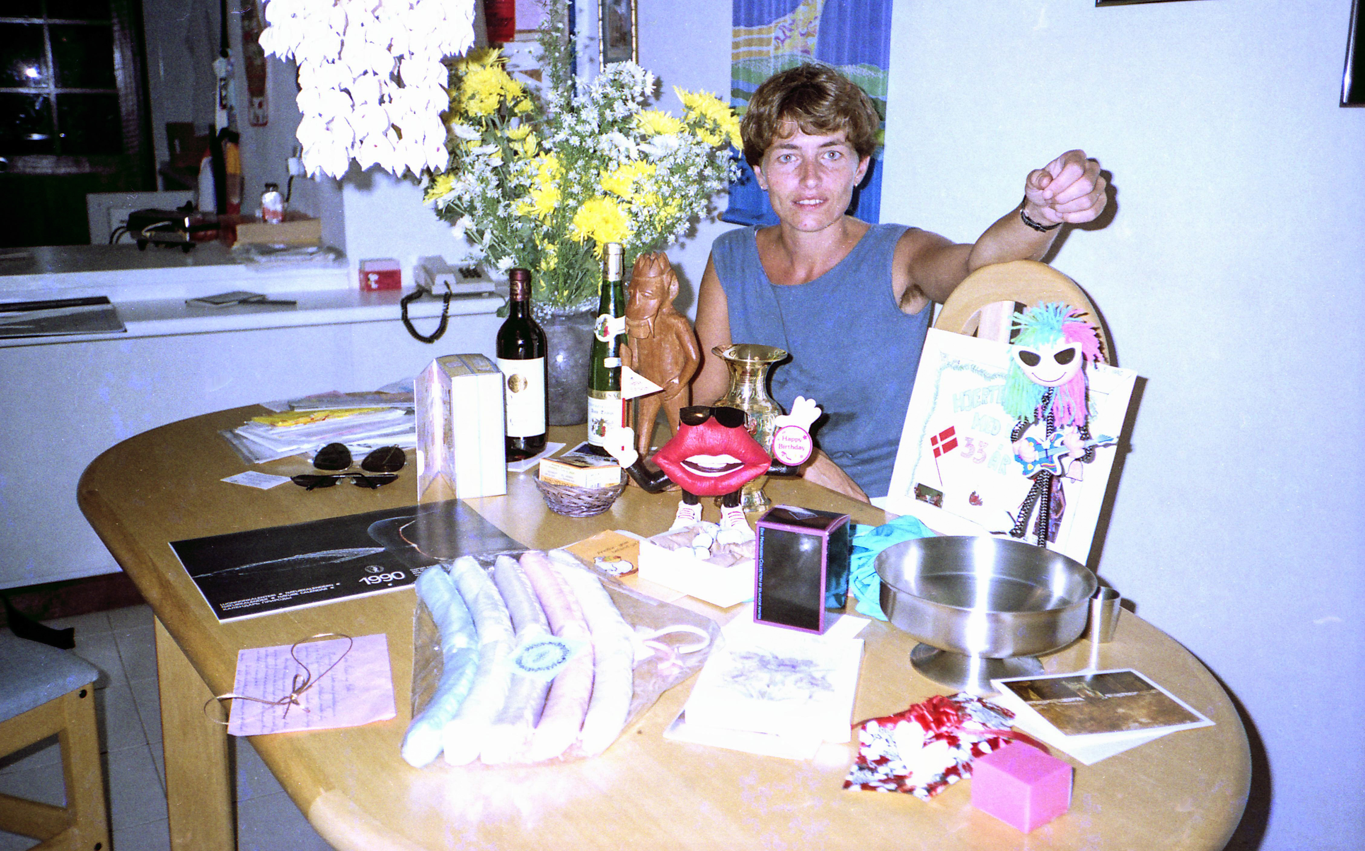 Gitte fik selvfølgelig en masse gaver – bla 6 skrækkelige, forede silkebøjler doneret af Claude & Anita. Det var dog ikke deres morsomste påfund. Til Bjarnes 40 års fødselsdag fik han en flaske Pronto!!! Har man nogensinde hørt lignende. Det gælder ihvertfald om at finde en grimasse, der kan passe, når man pakker gaver ud fra dem.