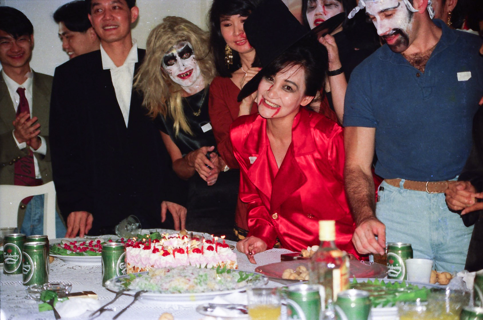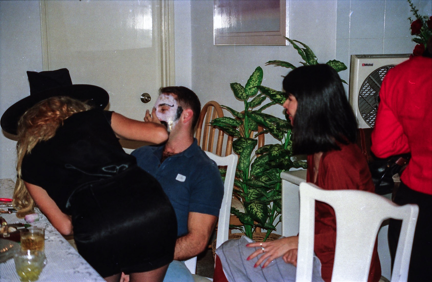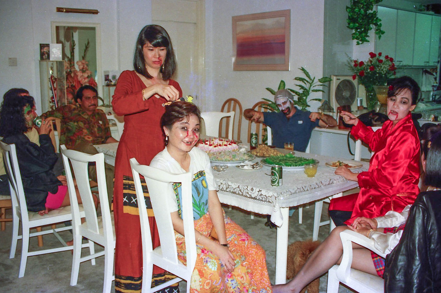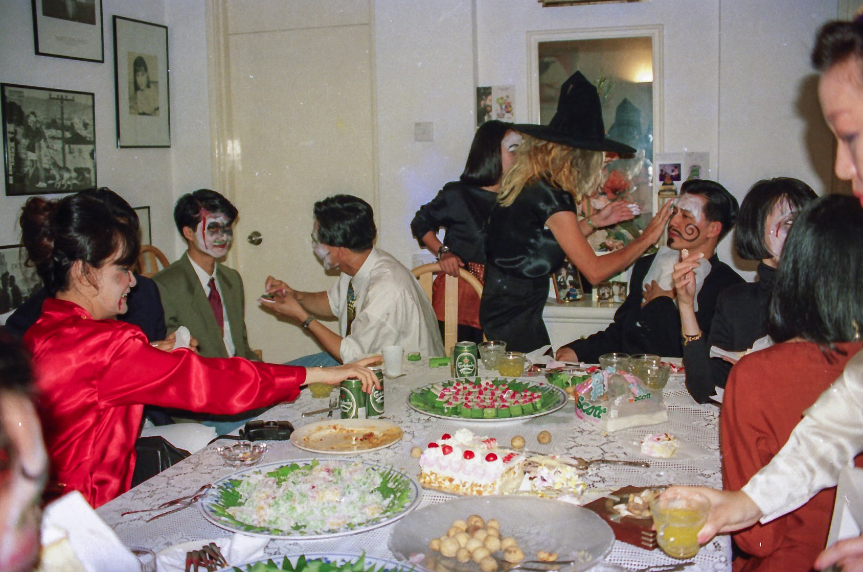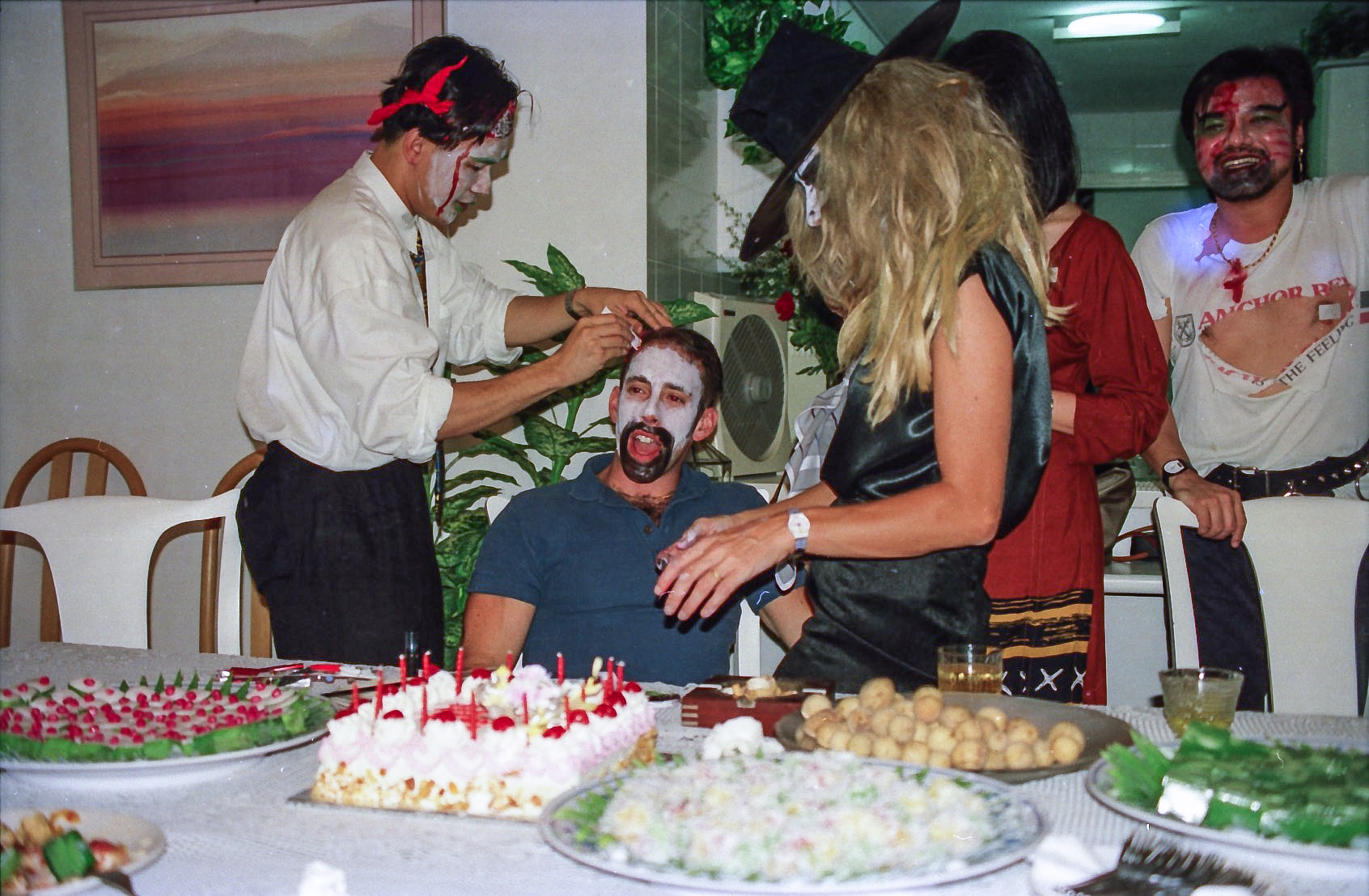 Hun fik fat i en stor kasse sminke, og så gik hun ellers i gang fra en ende af. Snart var alle gæster gjort meget uhyggelige – ihverfald i hovedet, og det satte faktisk god gang i stemningen.