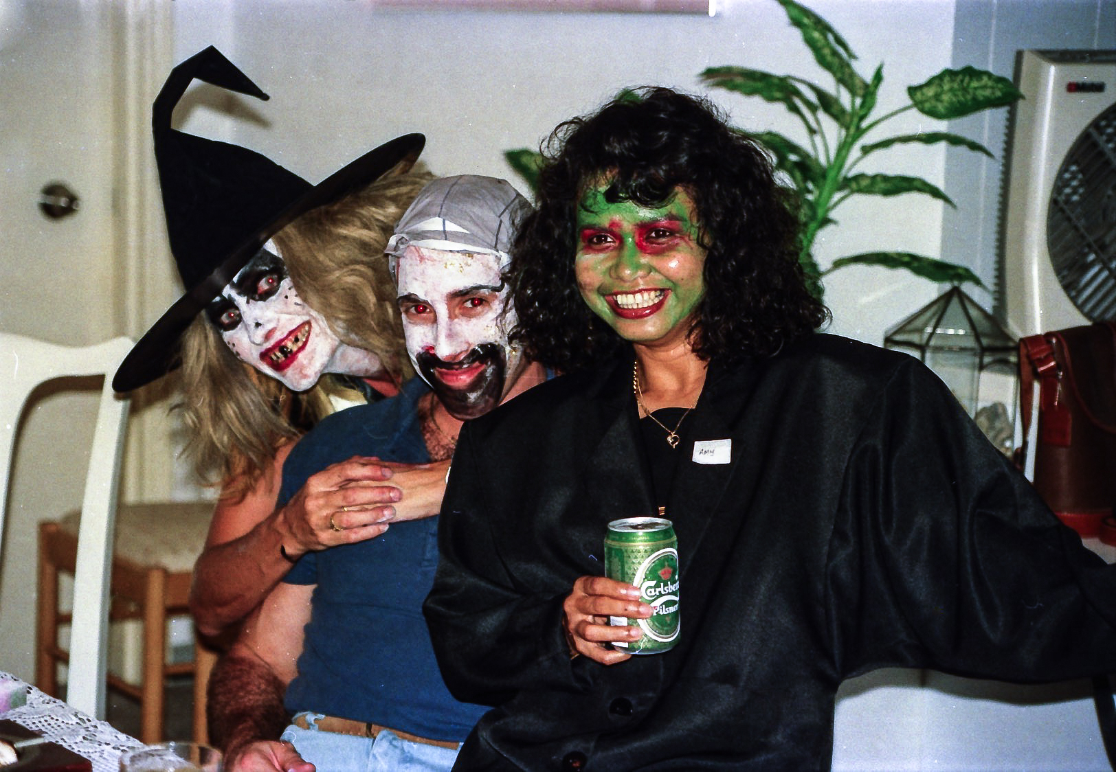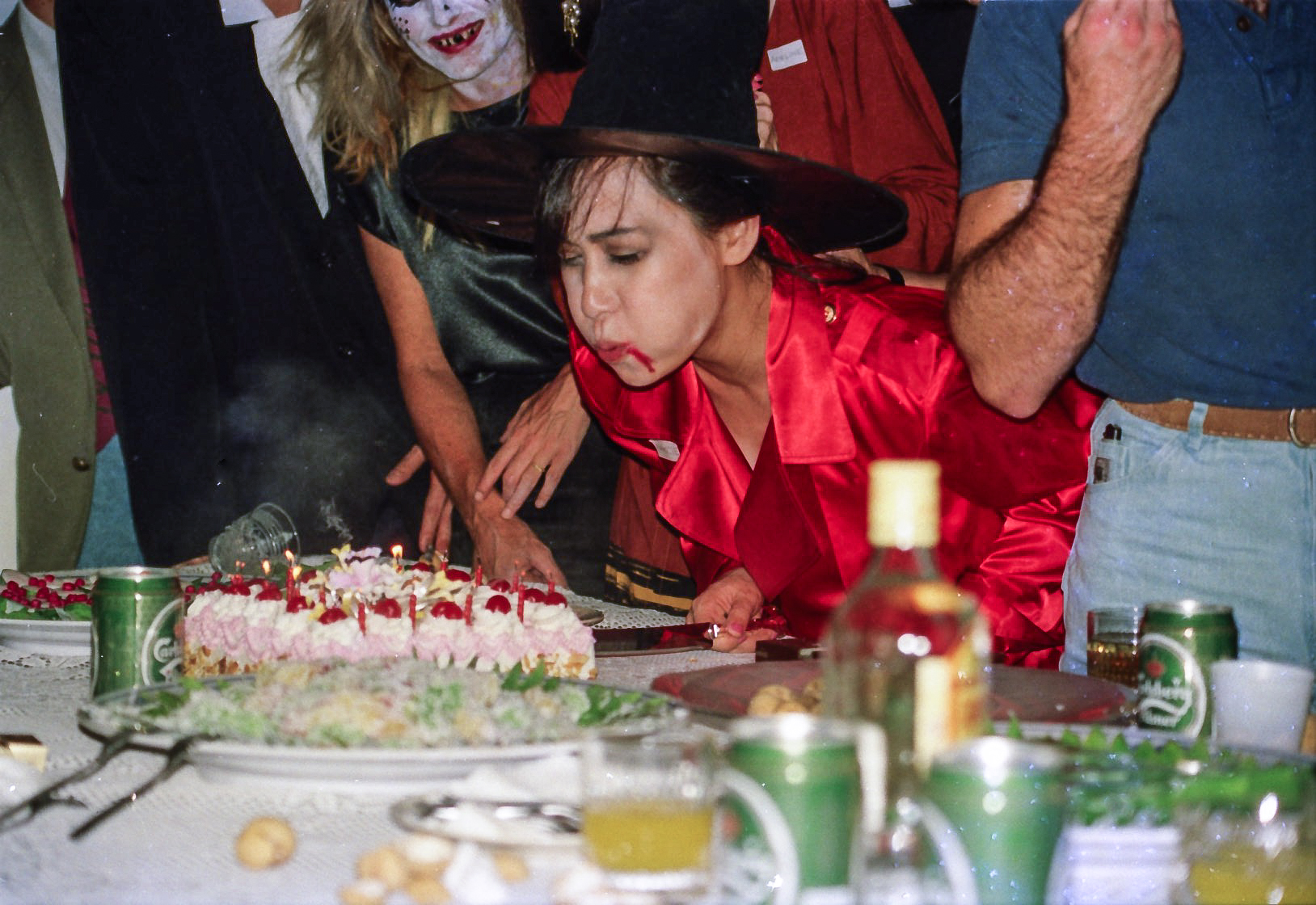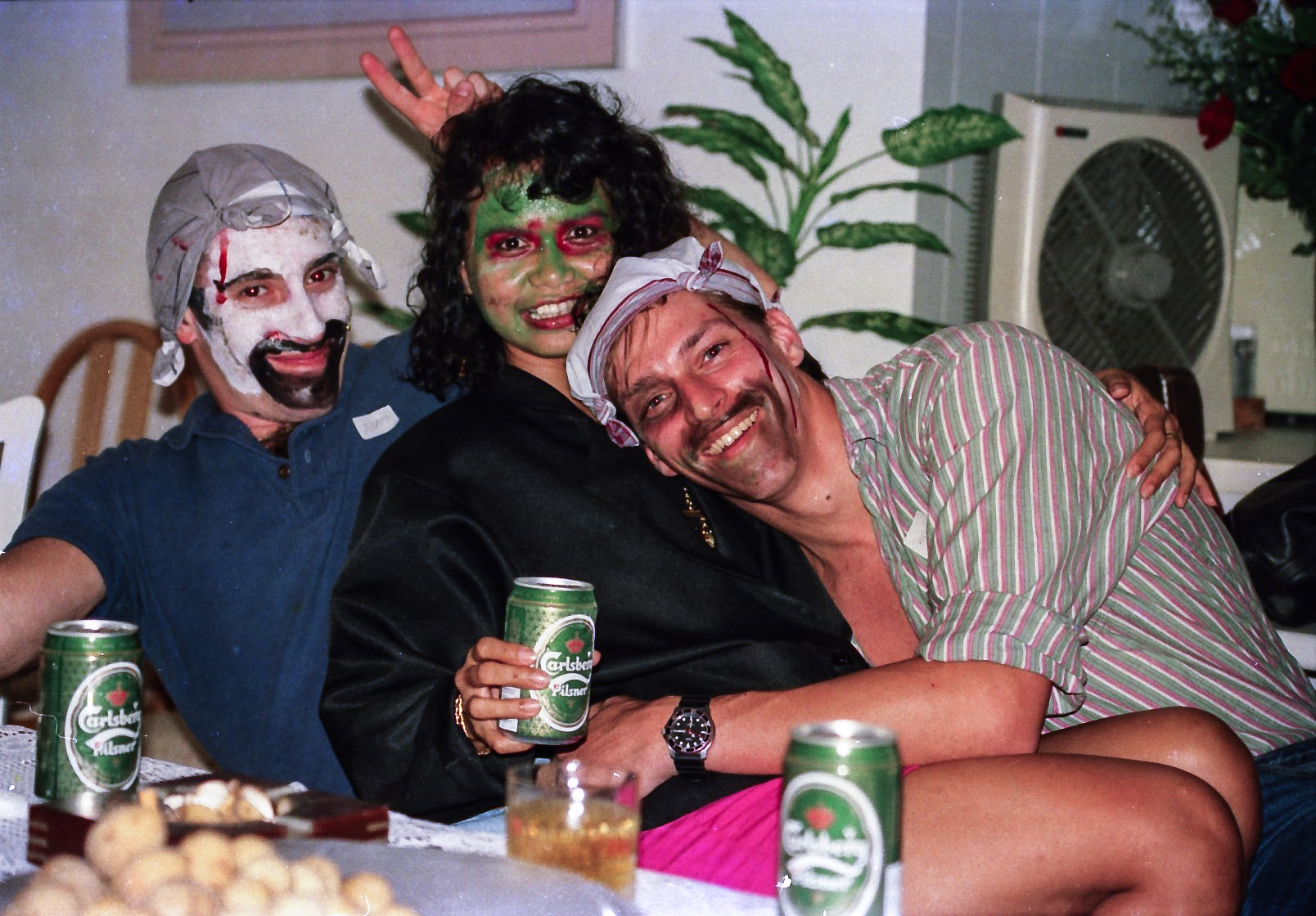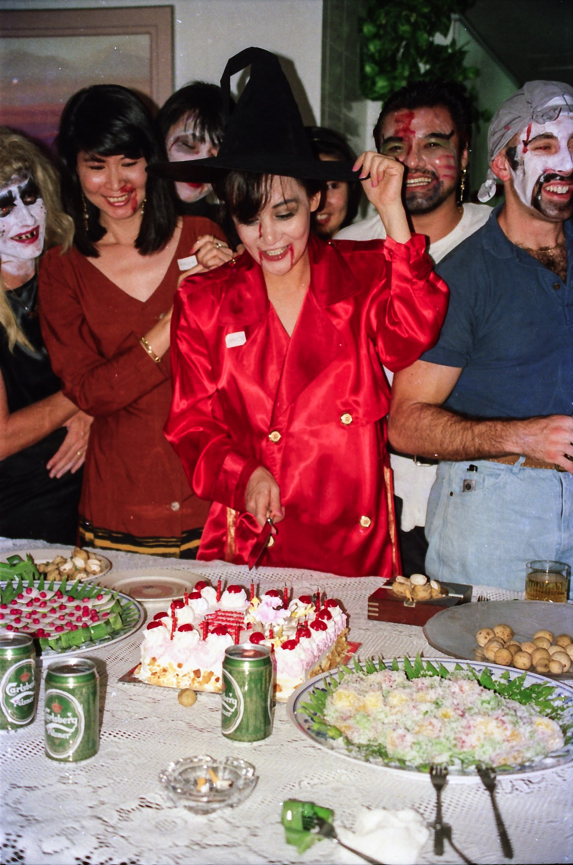 Hun fik fat i en stor kasse sminke, og så gik hun ellers i gang fra en ende af. Snart var alle gæster gjort meget uhyggelige – ihverfald i hovedet, og det satte faktisk god gang i stemningen.