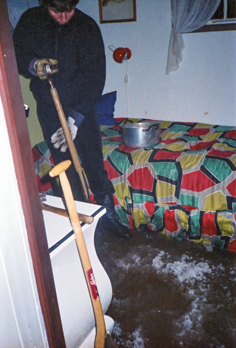 Jeg fik travlt med at få lukket ordentligt for vandet og hakke is af gulvene. Det var et stort arbejde, men omsider kom det meste da af. Vi fik stillet nogle elektriske varmeblæsere op, så isen kunne smelte helt og tingene tørre sådan nogenlunde over de følgende dage.