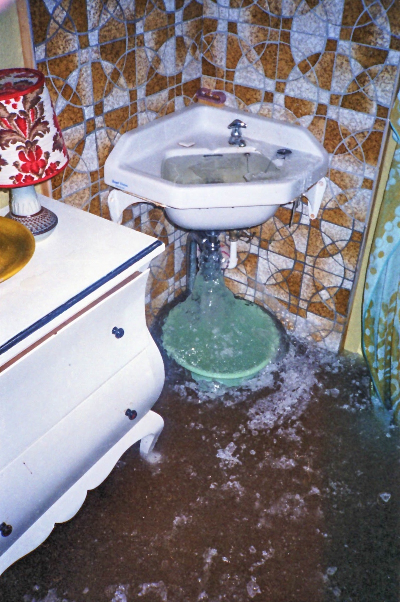 Vi havde åbenbart ikke fået lukket helt for vandet, og hanen i håndvasken var så begyndt at dryppe. I den strenge frost frøs vandet så til is og blokerede afløbet. Det betød at der kom mere og mere vand i vasken, indtil den tilsidst løb over, og efterhånden dannede skøjtebanerne i soveværelset og køkkenet.