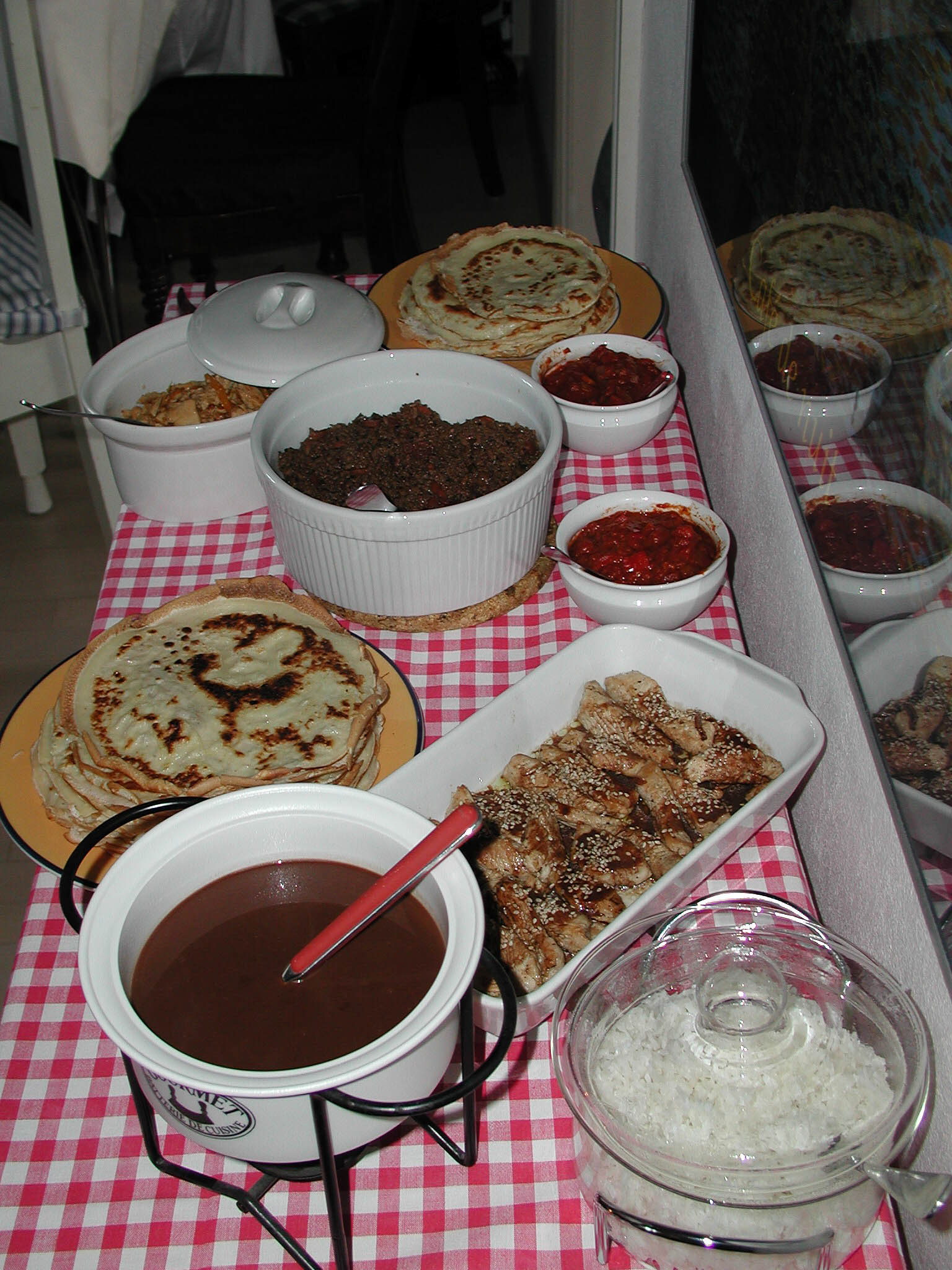 Mexikanske pandekager med kyllinge- og oksekødsfyld samt alverdens tilbehør.