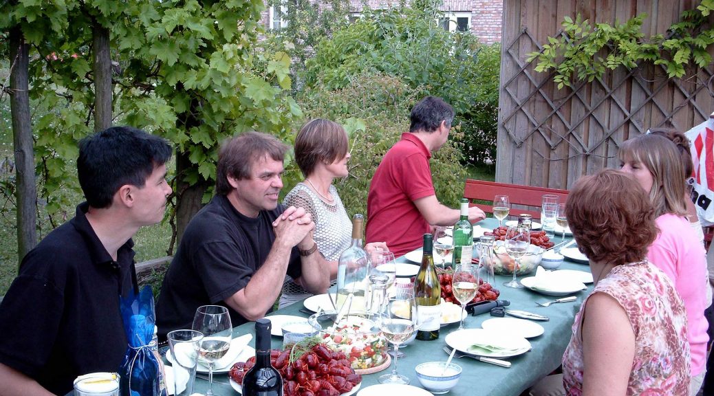 Menuen denne gang bestod af krebs, salat, flute og forskellige hjemmerørte dressinger, æblekage til dessert (se opskrift).