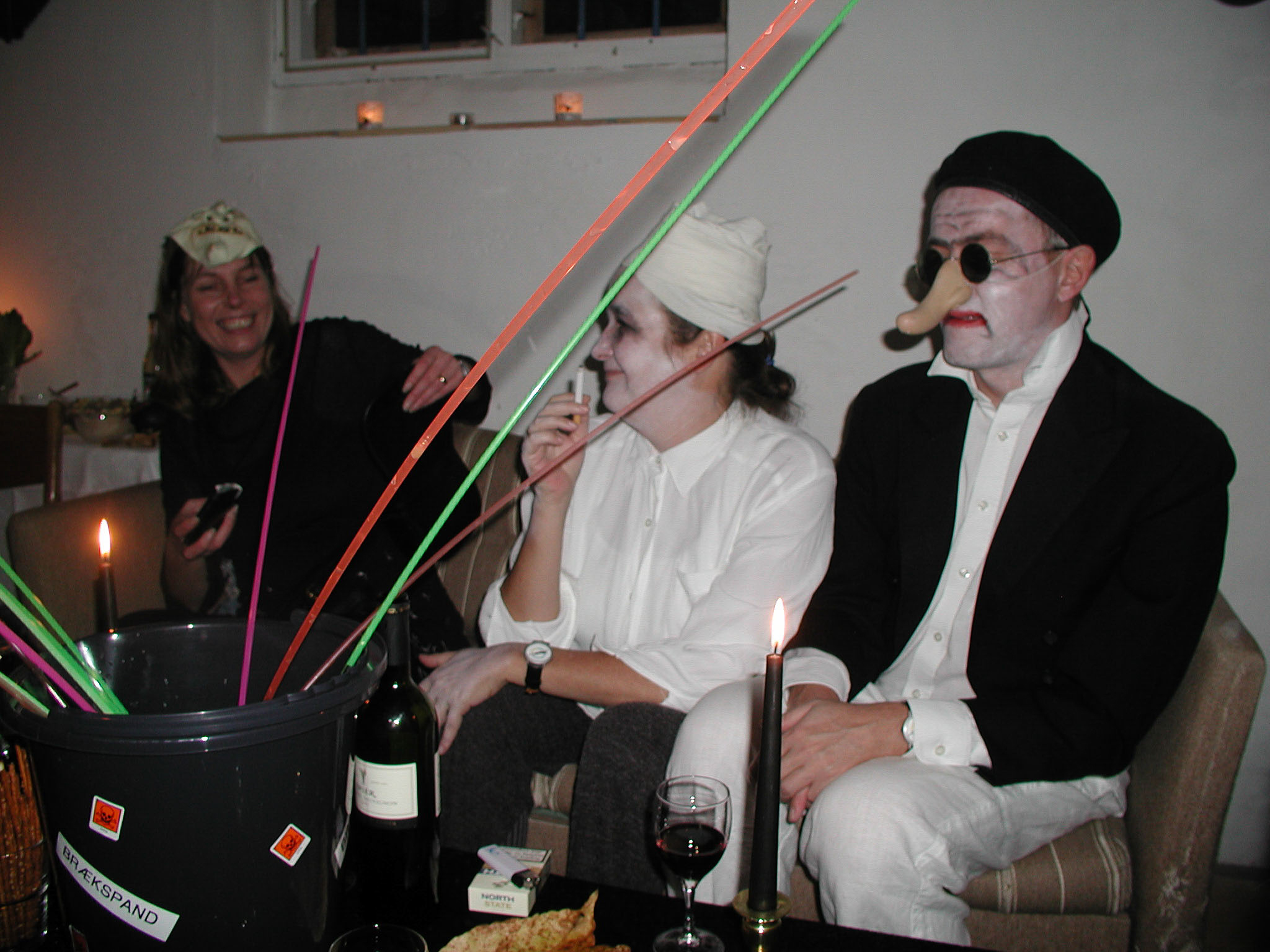 Dagsordenen blev gennemført i henhold til vedtægterne i Lene og Kims kælder i sterinlysenes skær. Vi konstaterede, at aftenen kostede 470 kroner. Med 11 deltagere kom der således 630 kroner + bøder i grisen. Regnskabet blev godkendt senere på aftenen, da Peter turde vise revisoren, Kim, sit regnskab. Trofæet har nu fået asyl hos Lene og Kim, indtil næste generalforsamling, som Vagn og Charlotte meldte sig til at holde.