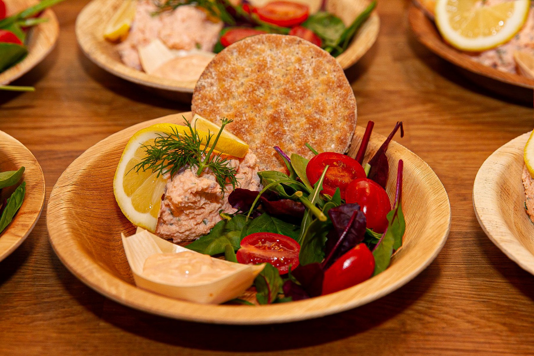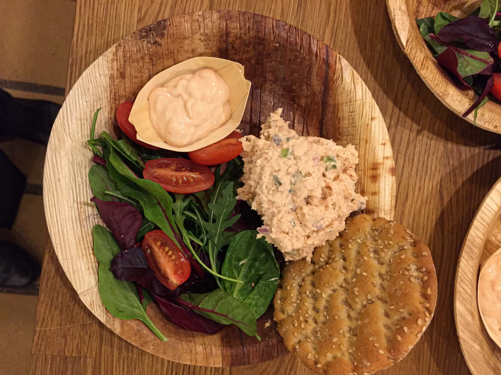 Laksemousse med grønt, dressing samt noget brød-kikse-agtigt.