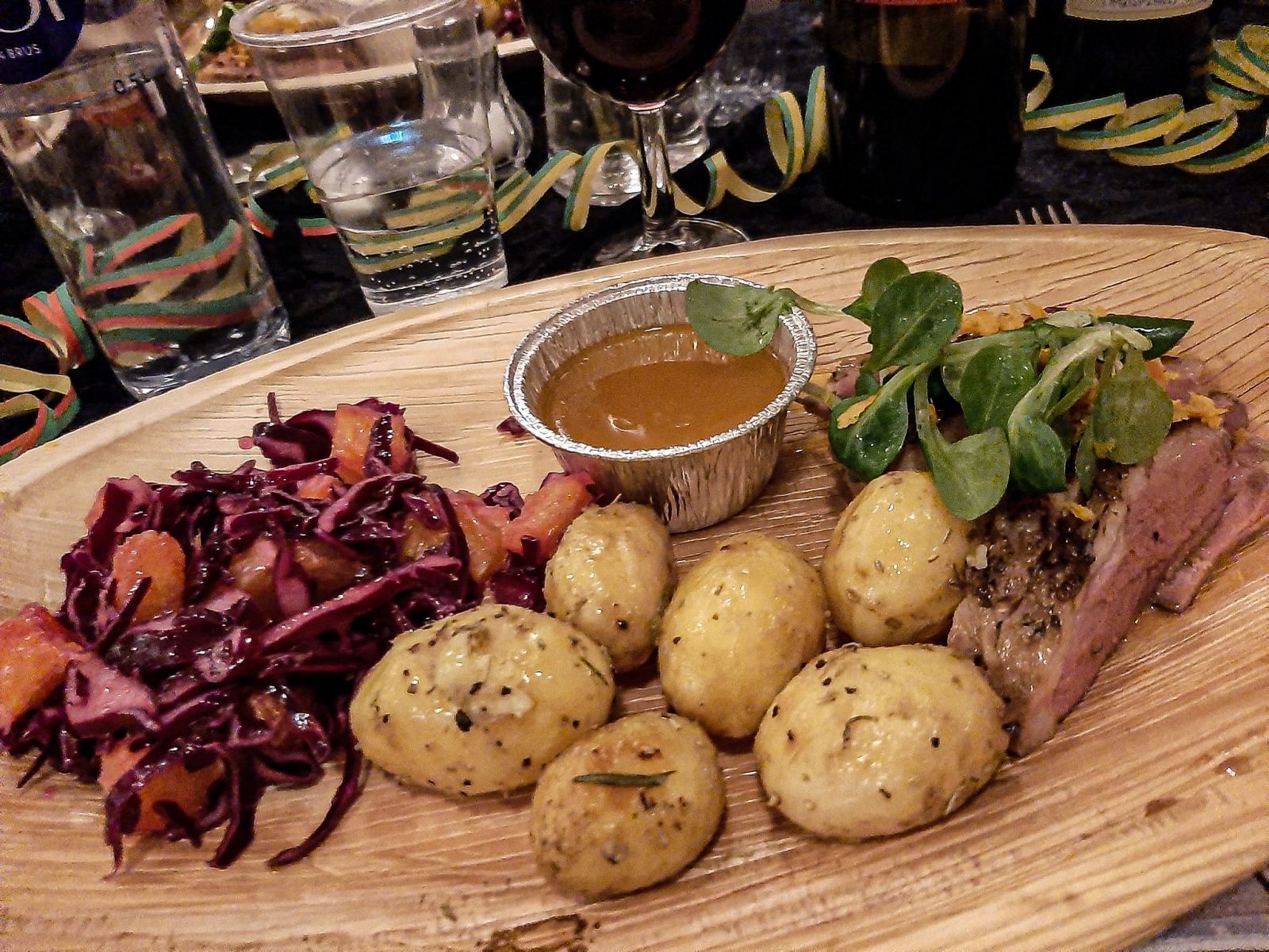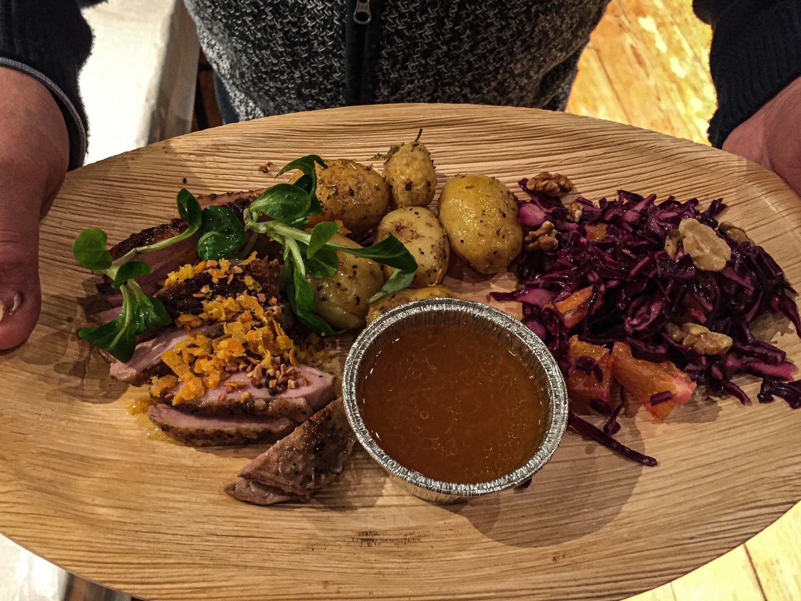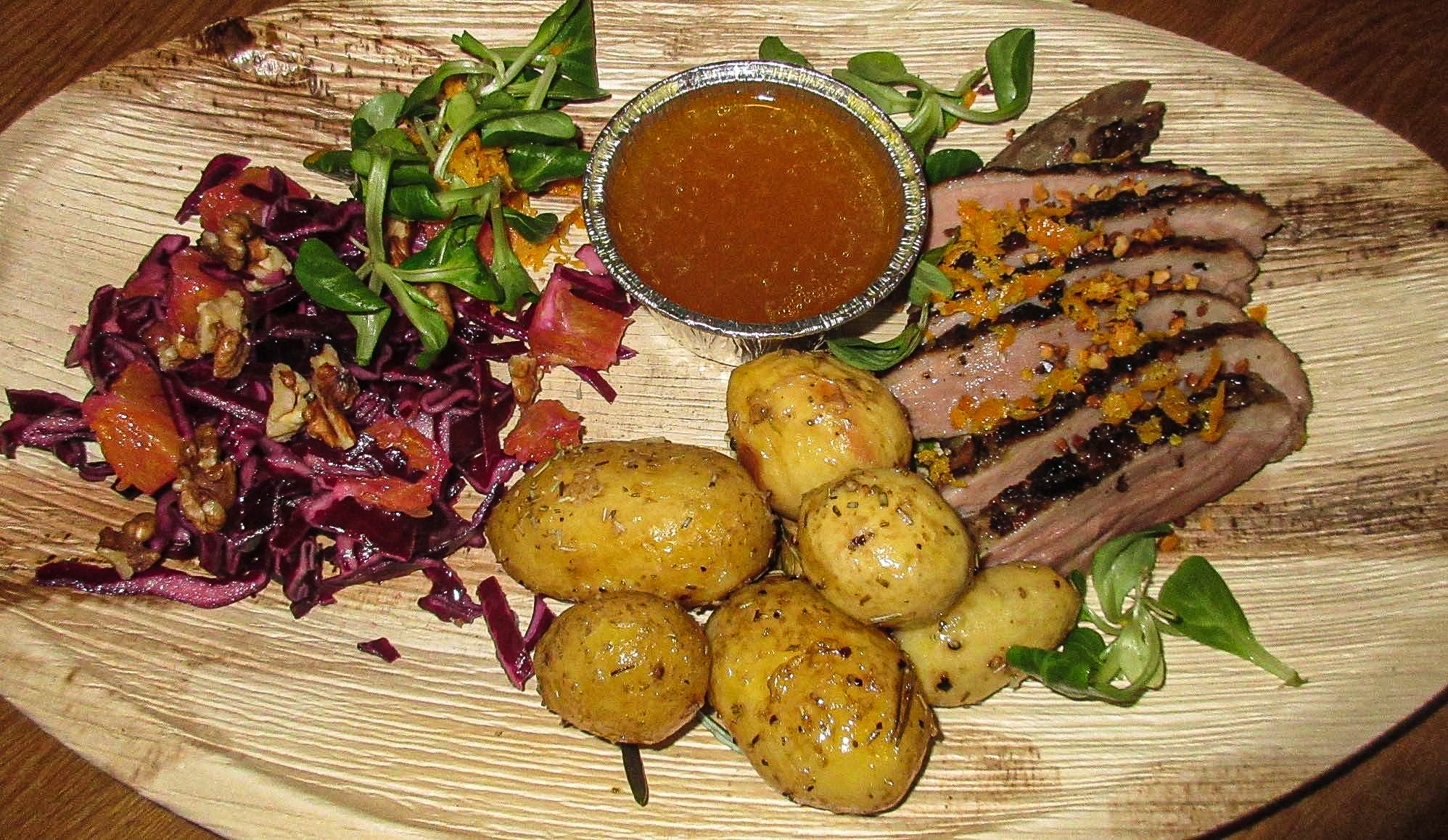 Andebryst med appelsinsovs, ovnbagte rosmarin-kartofler og rødkålssalat.