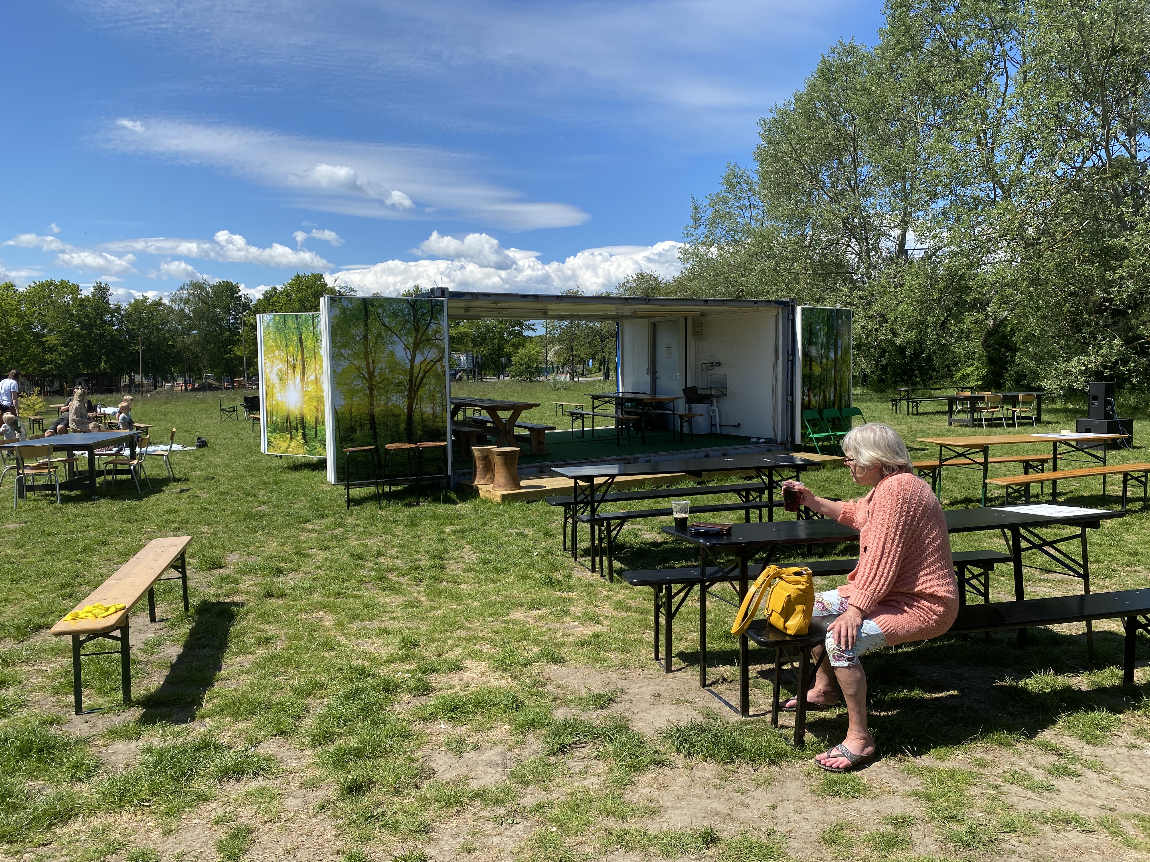 Der er opstillet borde og bænke på den store græsplæne, hvor det er muligt at nyde sommeren med lidt koldt at drikke.