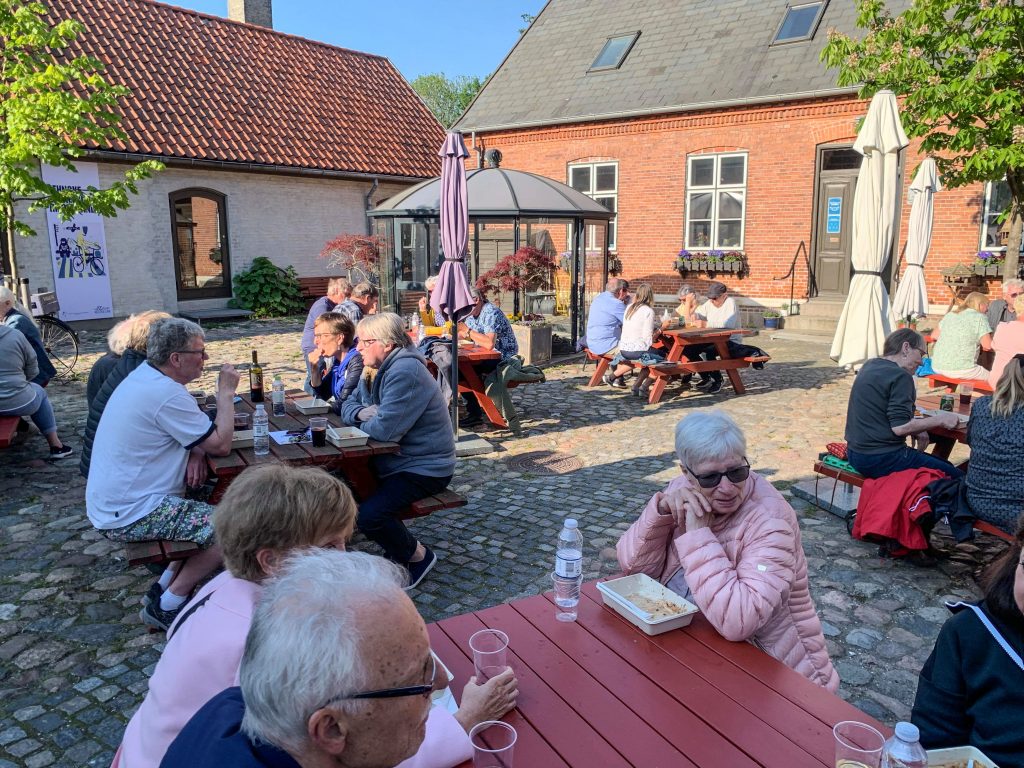 Noget inden dagen kunne vi jo godt se, at vi ikke behøvede at bekymre os om vejret. Solen skinnede og det var varmt, så vo droppede teltet og fik bare stillet nogle borde og bænke op på gårdspladsen