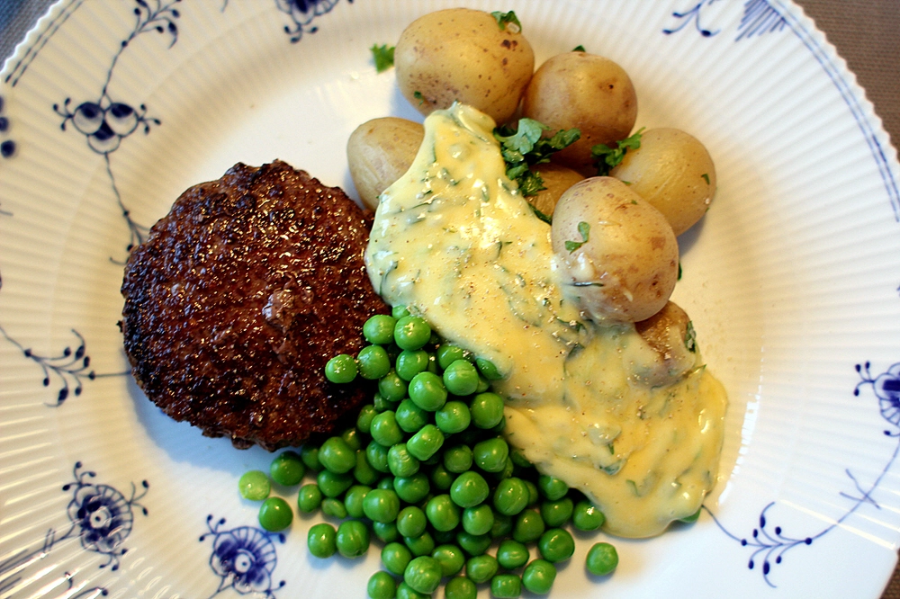 Hakkebøf med bearnaisesauce, ærter og ristede kartofler.