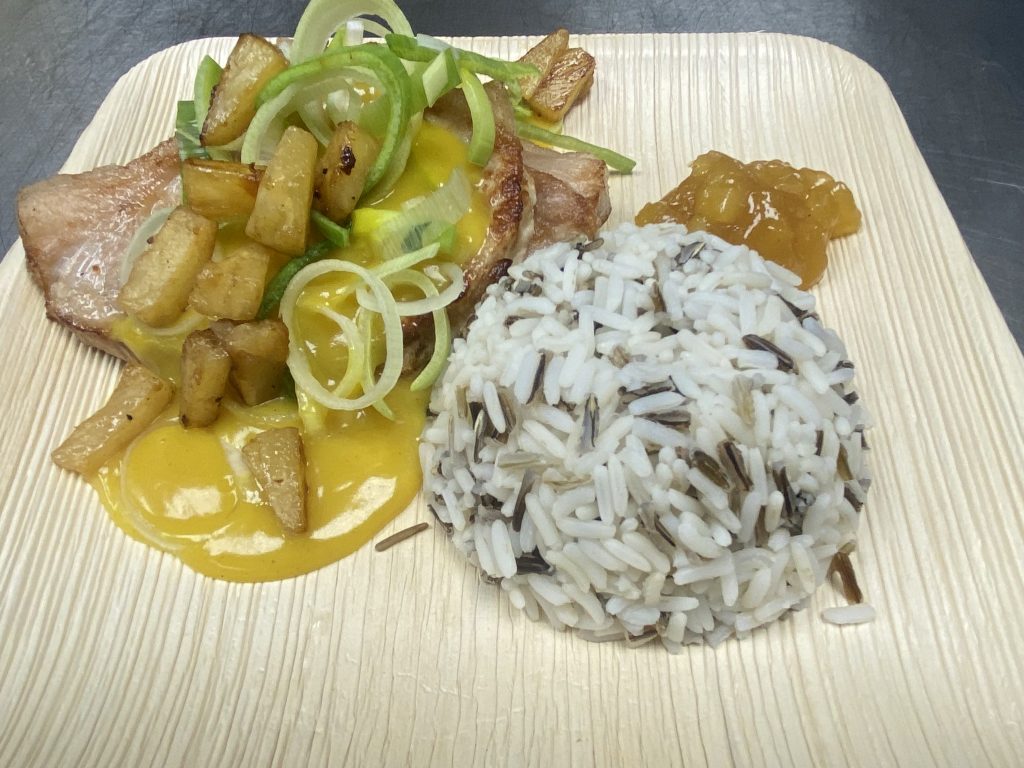 Fadkotelet med porrer, karrysauce, stegt ananas, mangochutney – med ris.