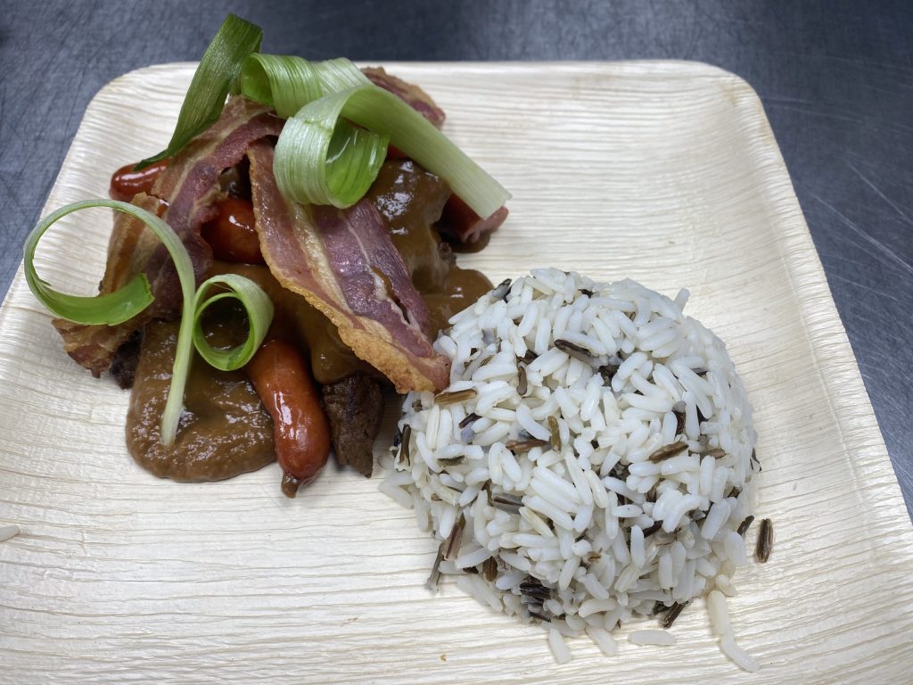 Husets sorte gryde med oksestrimler, bacon og cocktailpølser – med ris.