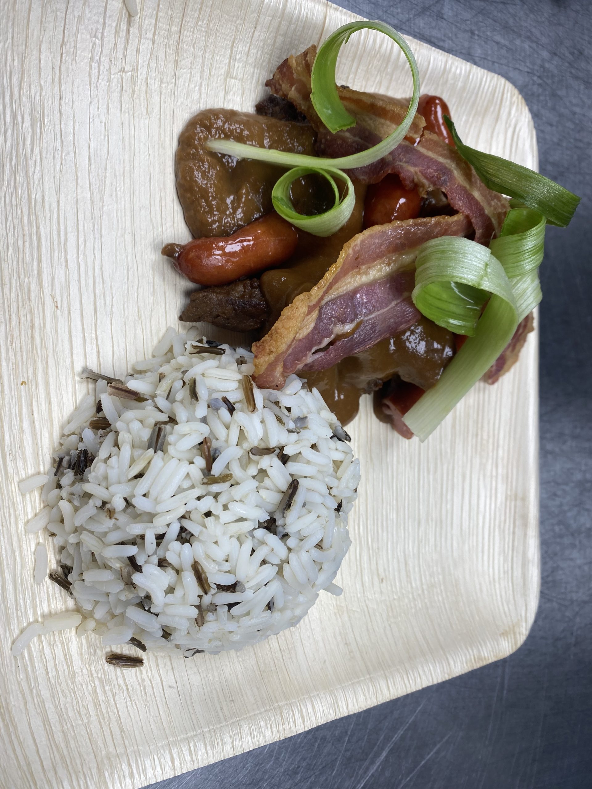 Husets sorte gryde med oksestrimler, bacon og cocktailpølser – med ris.