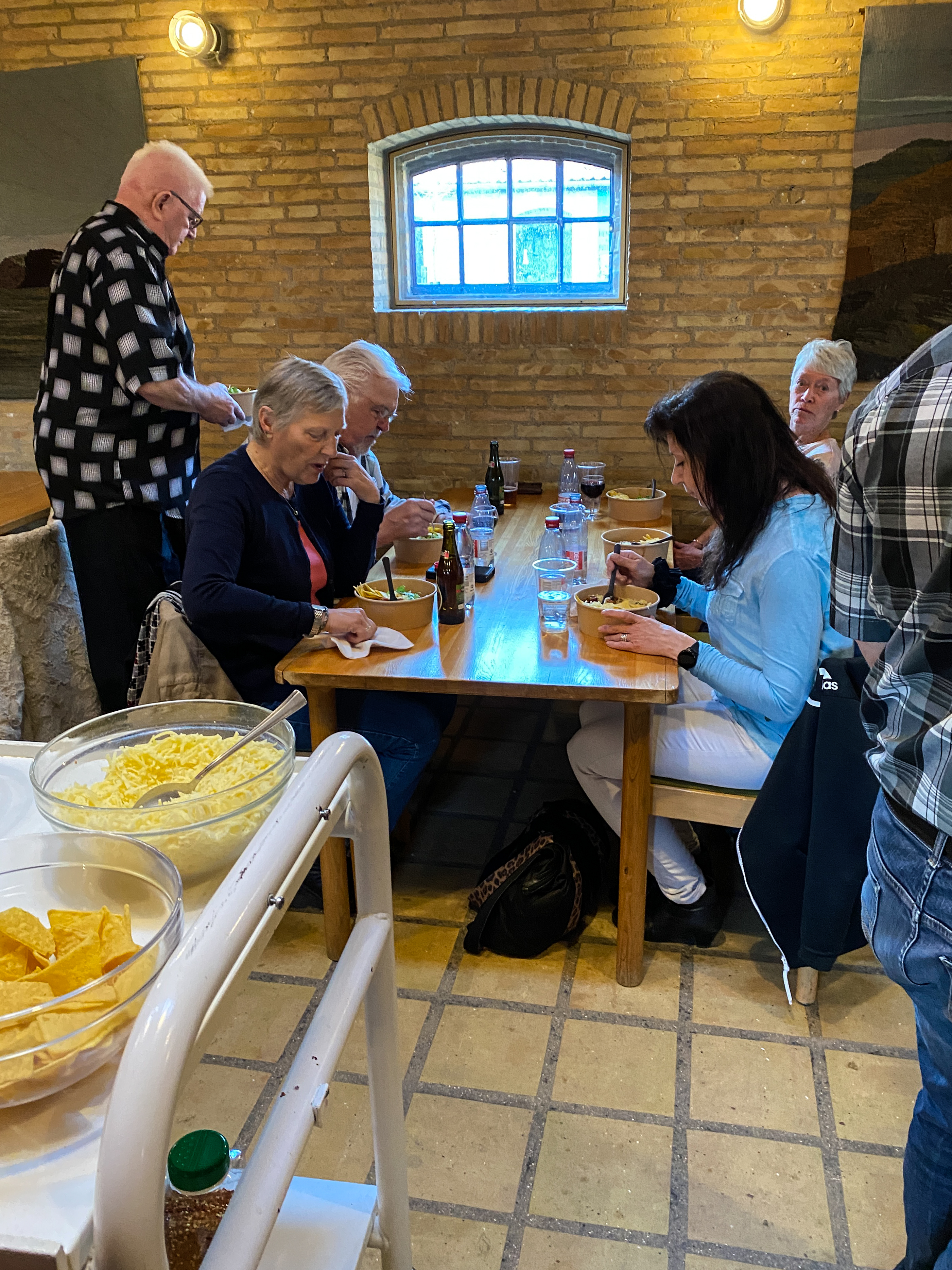 Vi startede med at servere en portion Chili con Carne, som Annemette, Kirsten og jeg havde bikset sammen om formiddagen. Vi tror at den faldt i de flestes smag.